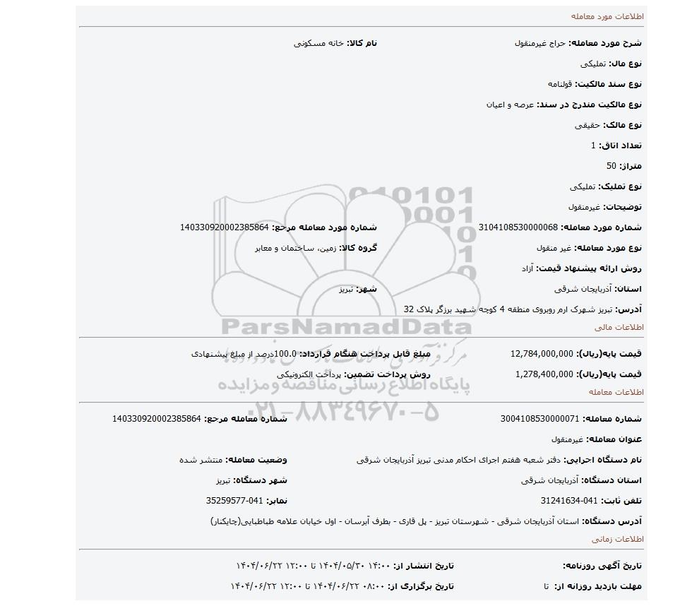| شرح مورد معامله: حراج غیرمنقول | نام کالا: خانه مسکونی | |