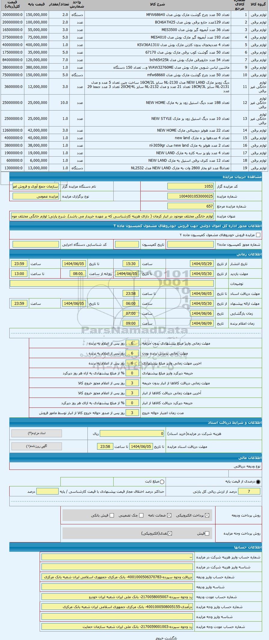 | کد مزایده گزار | 1053 | نام دستگاه مزایده گزار | سازمان جمع آوری و فروش اموال تملیکی | |