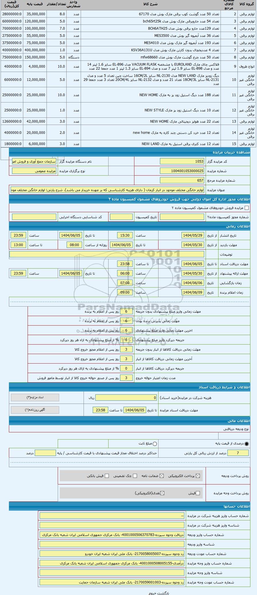 مزایده عمومی مزایده لوازم خانگی مختلف موجود در انبار کرمان ( دارای هزینه کارشناسی که بر عهده خریدار می باشد) برگزار میگردد. از کلیه افراد متخصص و شرکت‌های واجد شرایط دعوت به عمل می‌آید تا در این مزایده با کد خبرگزاری پارس نماد : 9444327 شرکت نمایند تاریخ شروع مزایده : 1404/05/29 مهلت شرکت در مزایده: تا پایان روز 1404/06/05 مکان برگزاری اموال واگذاری استان‌های کرمان و دسته‌بندی‌های مربوط به این حراجی متفرقه میباشد.