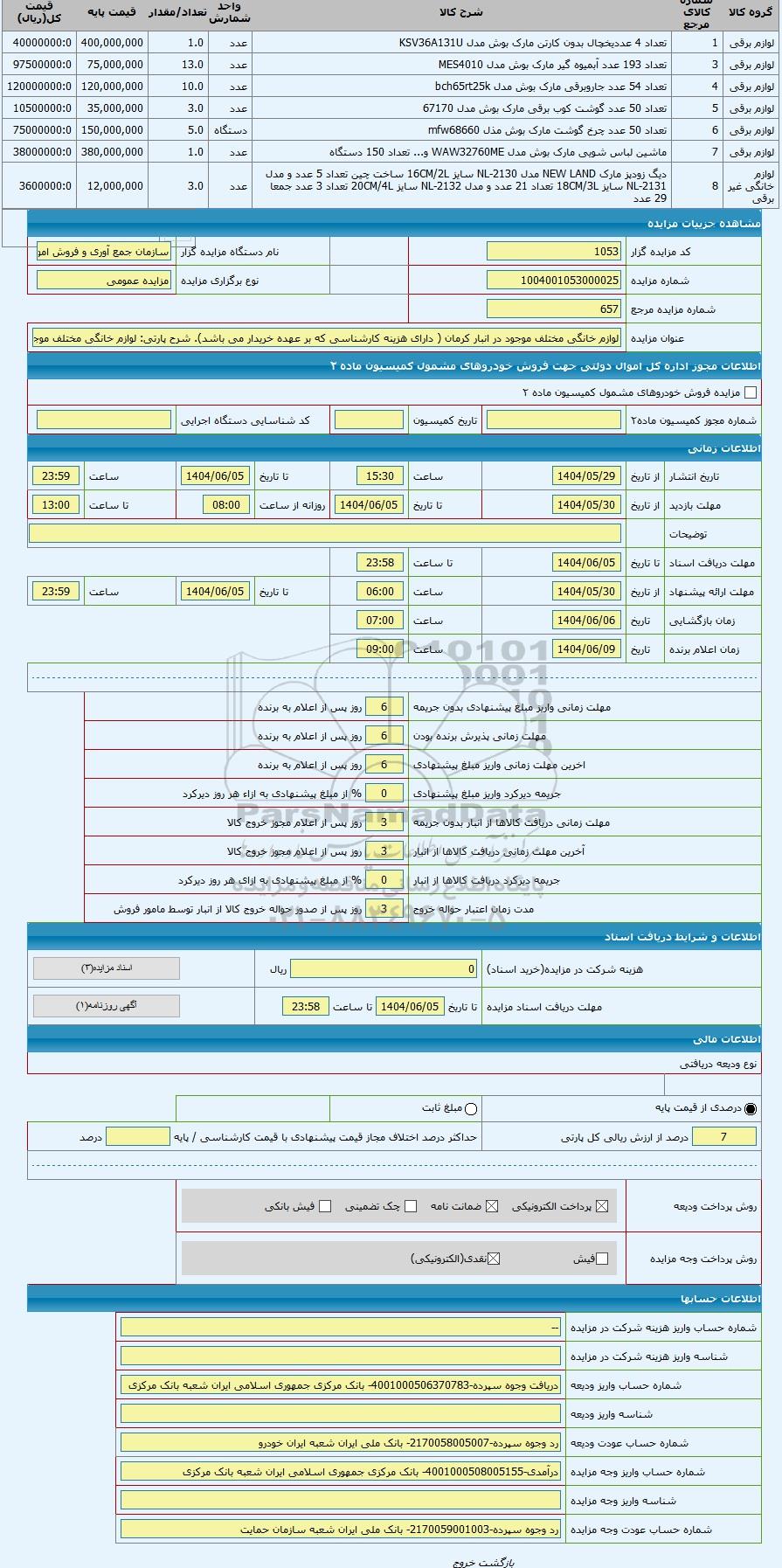 | عنوان مزایده | لوازم خانگی مختلف موجود در انبار کرمان ( دارای هزینه کارشناسی که بر عهده خریدار می باشد) | |||