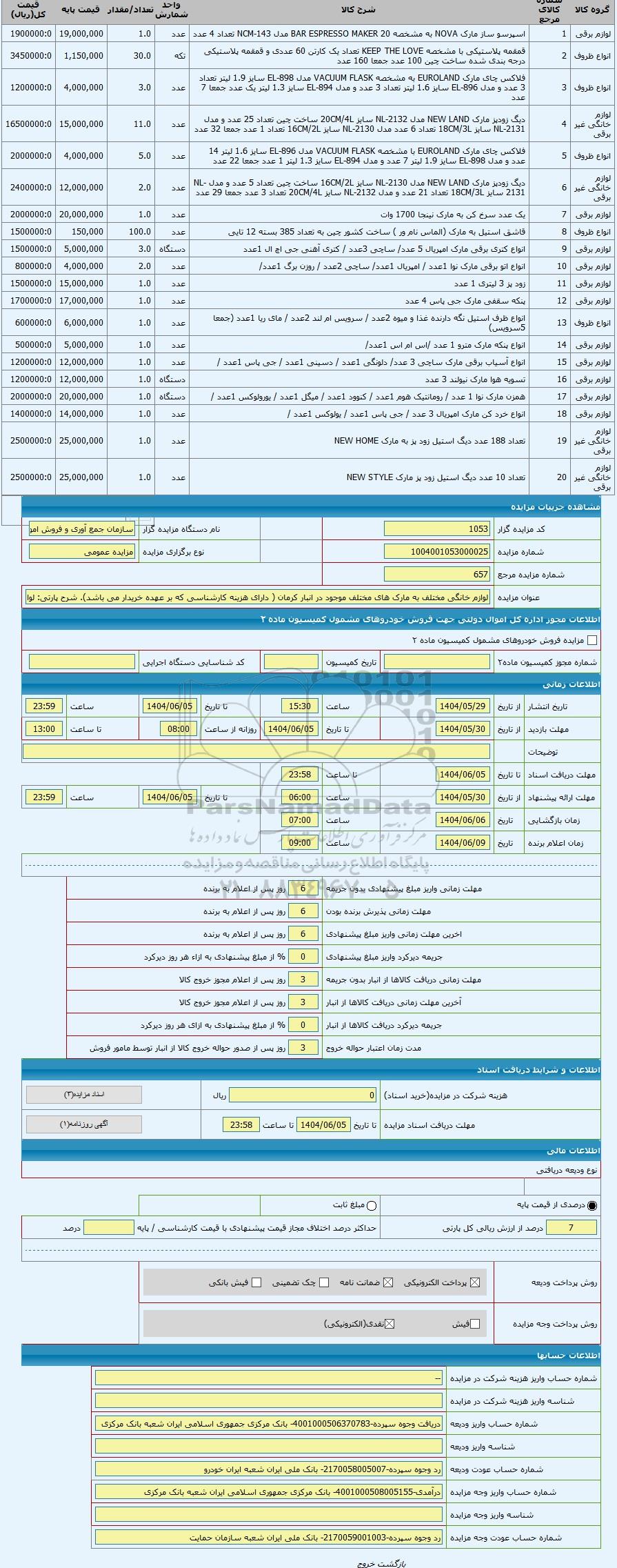 عنوان مزایدهلوازم خانگی مختلف به مارک های مختلف موجود در انبار کرمان ( دارای هزینه کارشناسی که بر عهده خریدار می باشد)