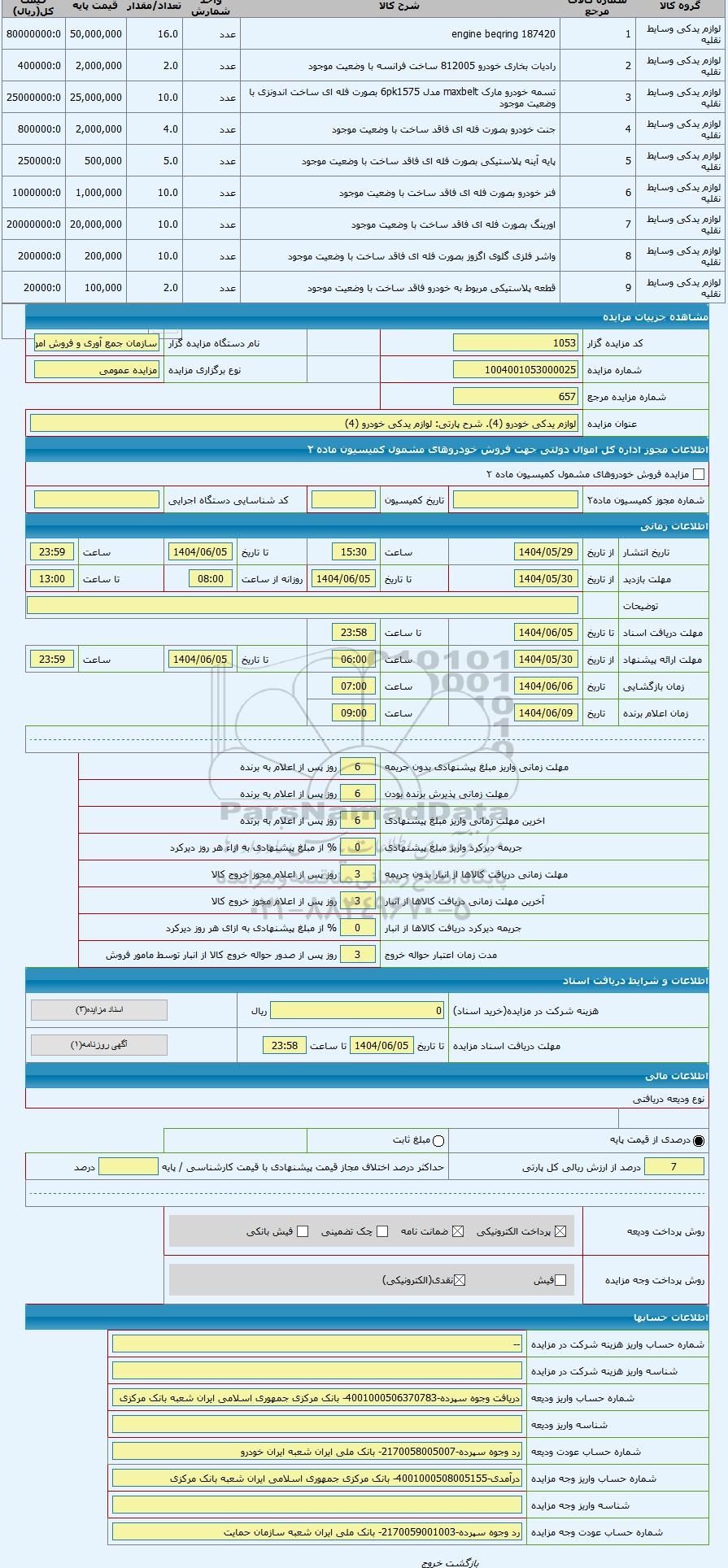 | عنوان مزایده | لوازم یدکی خودرو (4) | |||