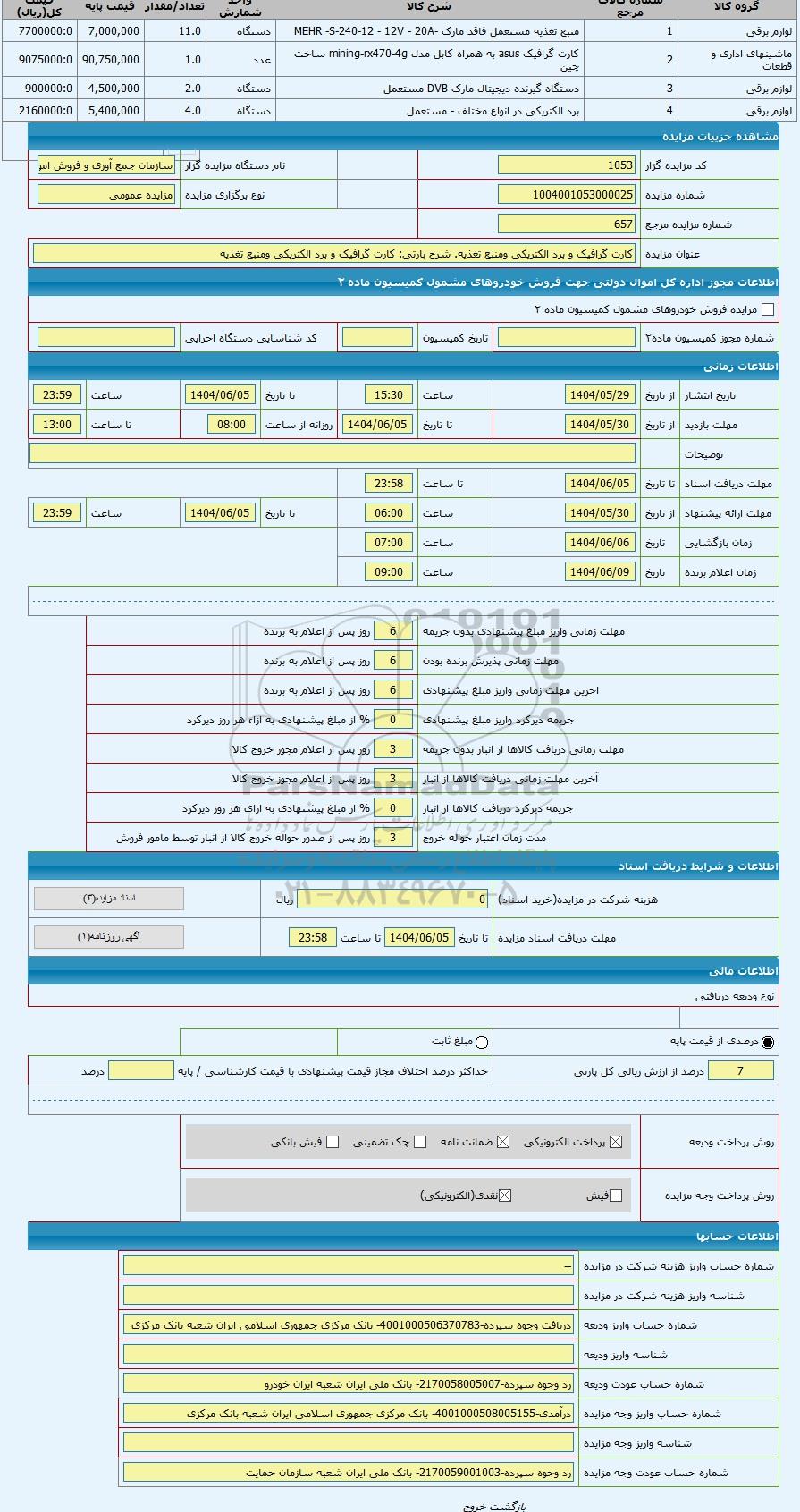 | عنوان مزایده | کارت گرافیک و برد الکتریکی ومنبع تغذیه | |||