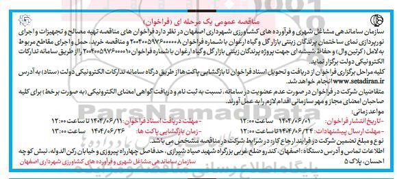 سازمان ساماندهی مشاغل شهری و فرآورده های کشاورزی شهرداری اصفهان در نظر دارد فراخوان های مناقصه تهیه مصالح و تجهیزات و اجرای نورپردازی نمای ساختمان پرندگان زینتی بازار گل و گیاه ارغوان با شماره فراخوان 2004005976000008 و مناقصه خرید، حمل و اجرای مقاطع مربوط به لامل (کرتین وال ) و حفاظ شیشه ای جهت پروژه پرندگان زینتی بازار گل و گیاه ارغوان با شماره فراخوان 2004005976000010 را از طریق سامانه تدارکات الکترونیکی دولت برگزار نماید.