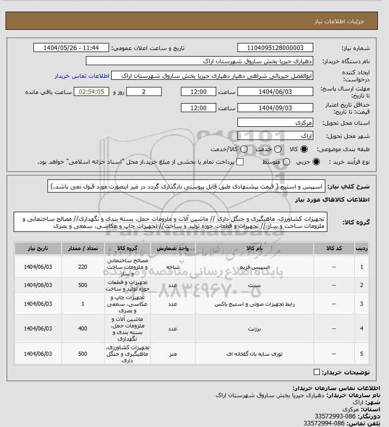 | 2 | -- | بست | عدد | تجهیزات و قطعات حوزه تولید و ساخت | 500 | 1404/06/03 |