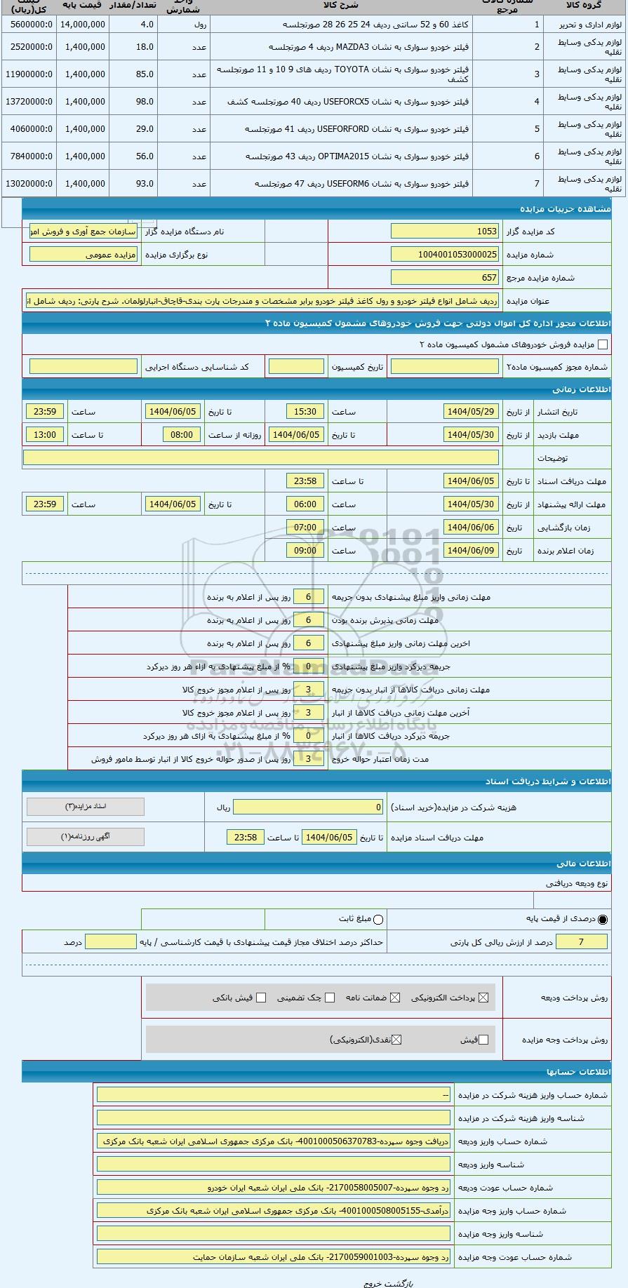 | کد مزایده گزار | 1053 | نام دستگاه مزایده گزار | سازمان جمع آوری و فروش اموال تملیکی | |