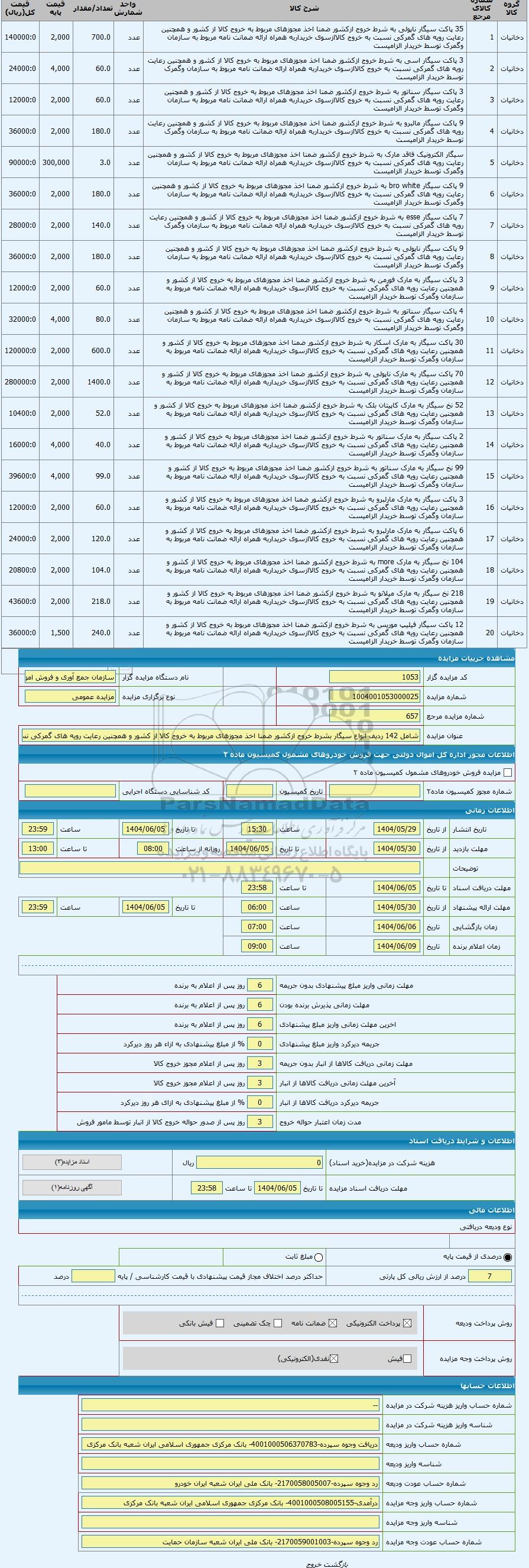 مزایده ، شامل 142 ردیف انواع سیگار بشرط خروج ازکشور ضمنا اخذ مجوزهای مربوط به خروج کالا از کشور و همچنین رعایت رویه های گمرکی نس