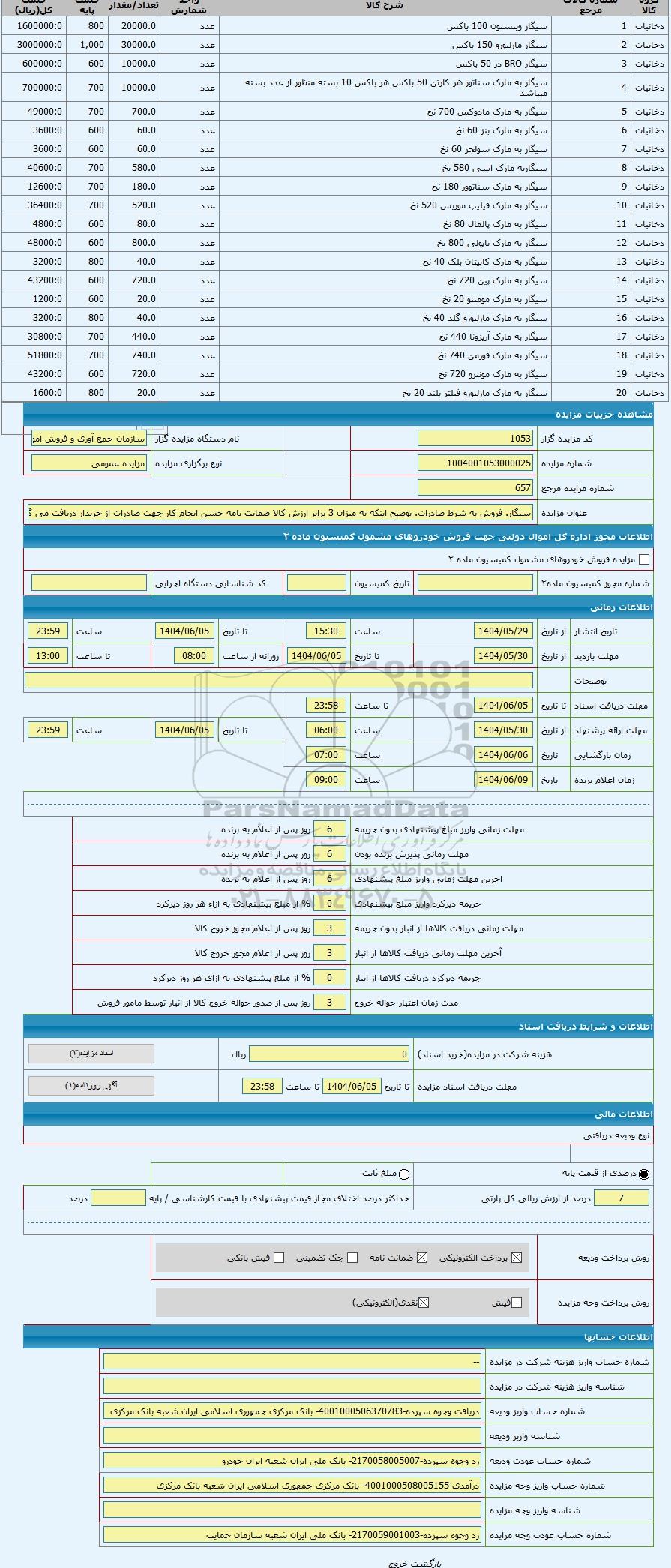 مزایده عمومی مزایده سیگار. فروش به شرط صادرات. توضیح اینکه به میزان 3 برابر ارزش کالا ضمانت نامه حسن انجام کار جهت صادرات از خریدار دریافت برگزار میگردد. از کلیه افراد متخصص و شرکت‌های واجد شرایط دعوت به عمل می‌آید تا در این مزایده با کد خبرگزاری پارس نماد : 9444884 شرکت نمایند تاریخ شروع مزایده : 1404/05/29 مهلت شرکت در مزایده: تا پایان روز 1404/06/05 مکان برگزاری اموال واگذاری استان‌های تهران و دسته‌بندی‌های مربوط به این حراجی متفرقه میباشد.