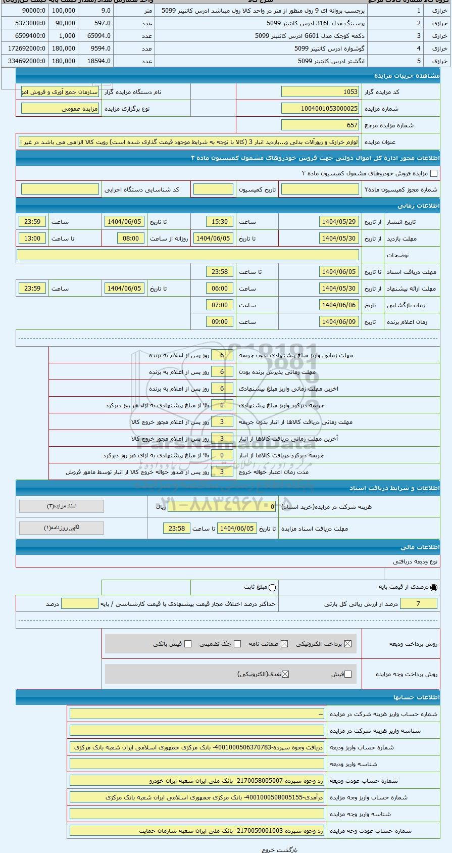 | کد مزایده گزار | 1053 | نام دستگاه مزایده گزار | سازمان جمع آوری و فروش اموال تملیکی | |