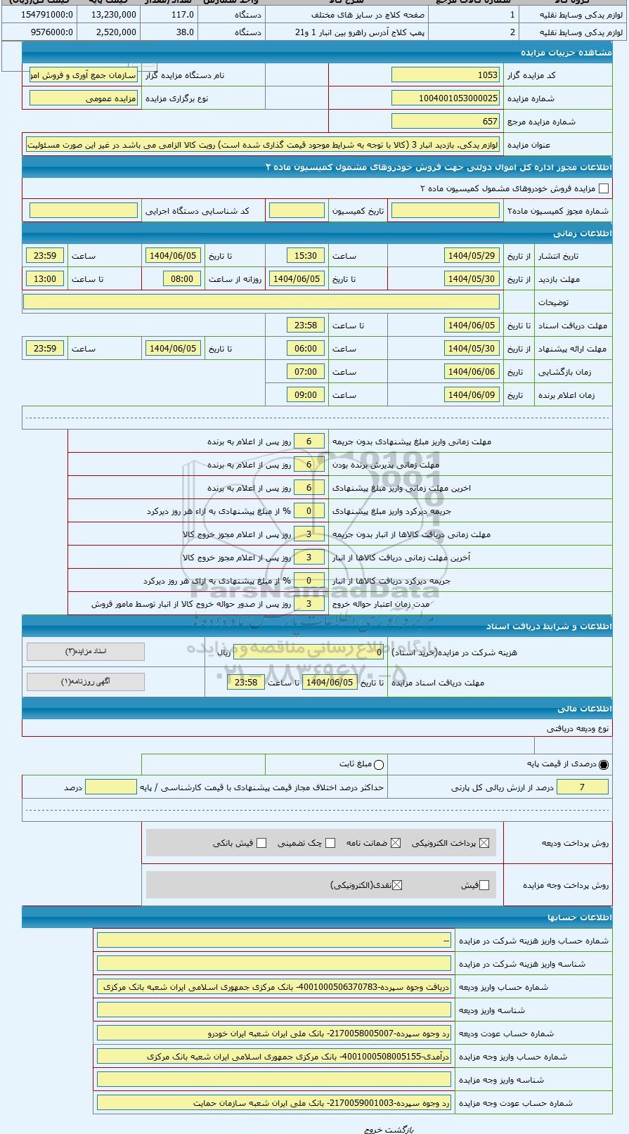 | کد مزایده گزار | 1053 | نام دستگاه مزایده گزار | سازمان جمع آوری و فروش اموال تملیکی | |