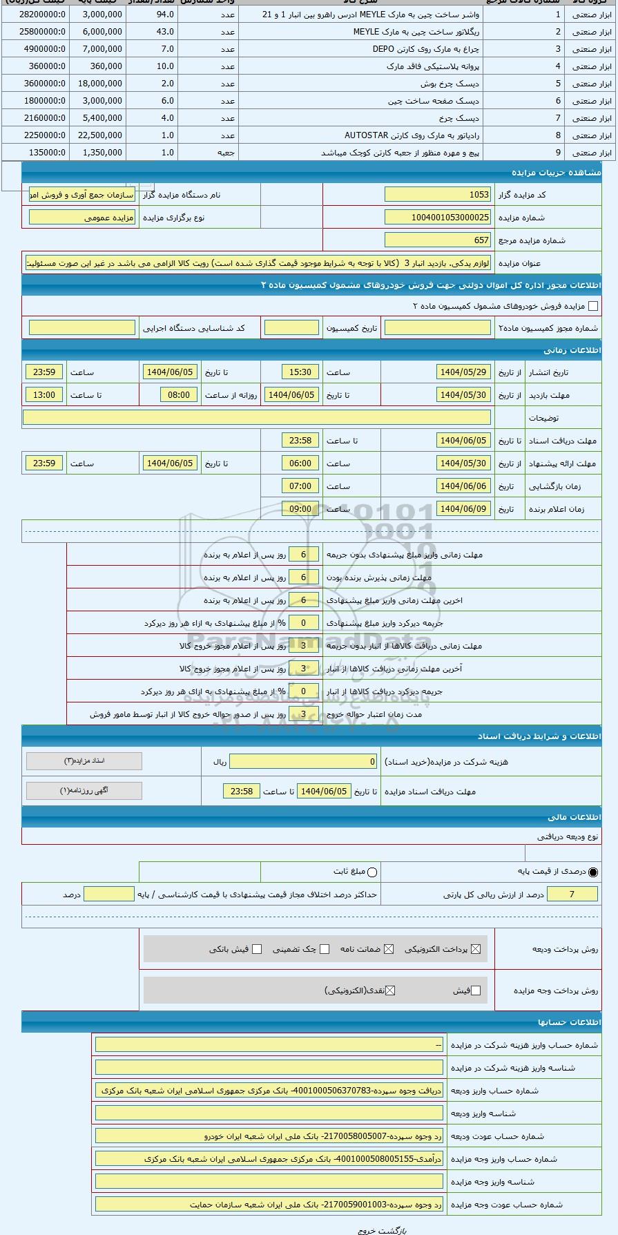 عنوان مزایدهلوازم یدکی. بازدید انبار 3 (کالا با توجه به شرایط موجود قیمت گذاری شده است) رویت کالا الزامی می باشد در غیر این صورت مسئولیت آن بر عهده خریدار می باشد.