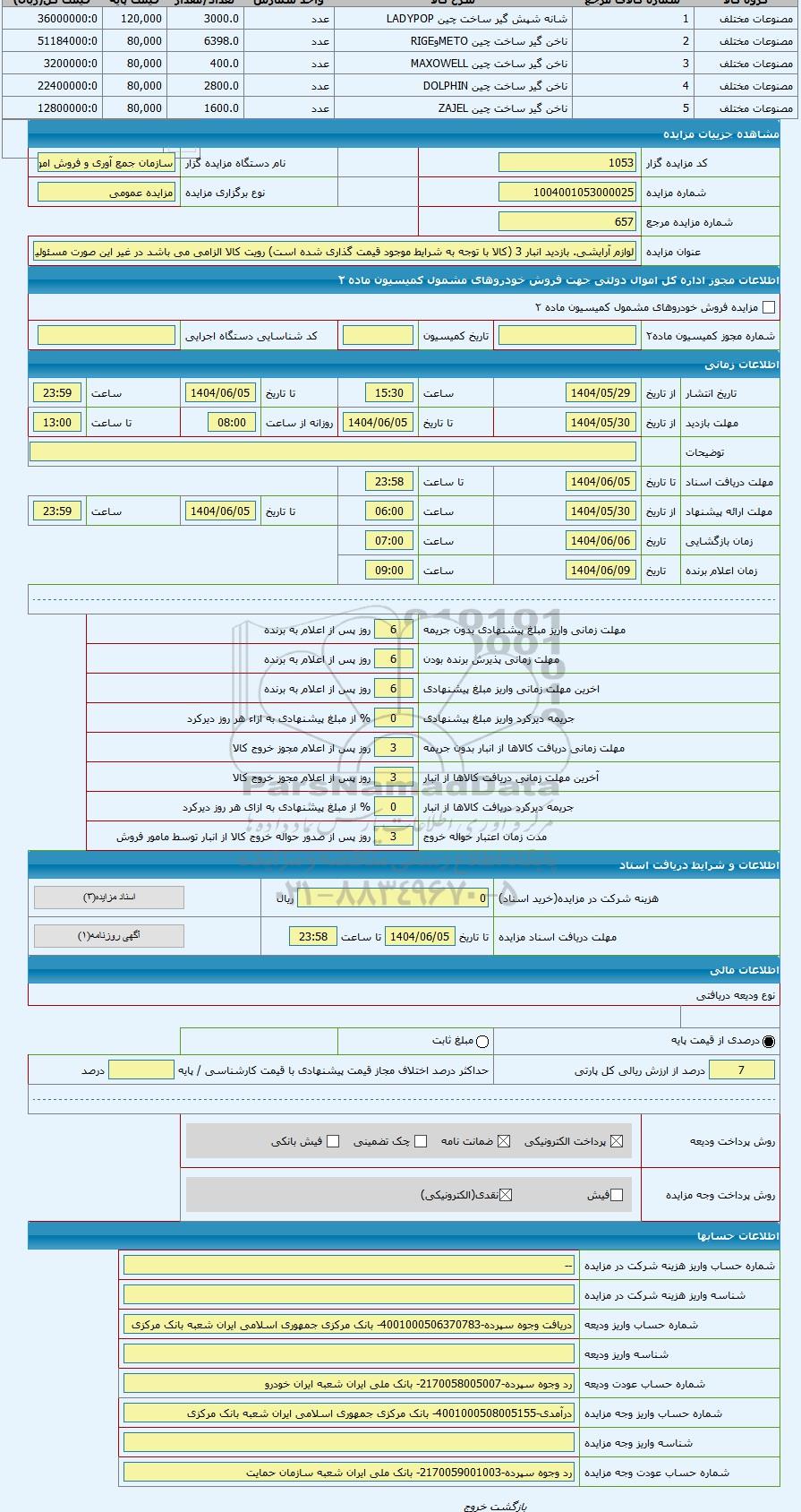 مزایده عمومی مزایده لوازم آرایشی. بازدید انبار 3 (کالا با توجه به شرایط موجود قیمت گذاری شده است) رویت کالا الزامی می باشد در غیر این صورت برگزار میگردد. از کلیه افراد متخصص و شرکت‌های واجد شرایط دعوت به عمل می‌آید تا در این مزایده با کد خبرگزاری پارس نماد : 9445368 شرکت نمایند تاریخ شروع مزایده : 1404/05/29 مهلت شرکت در مزایده: تا پایان روز 1404/06/05 مکان برگزاری اموال واگذاری استان‌های تهران و دسته‌بندی‌های مربوط به این حراجی متفرقه میباشد.