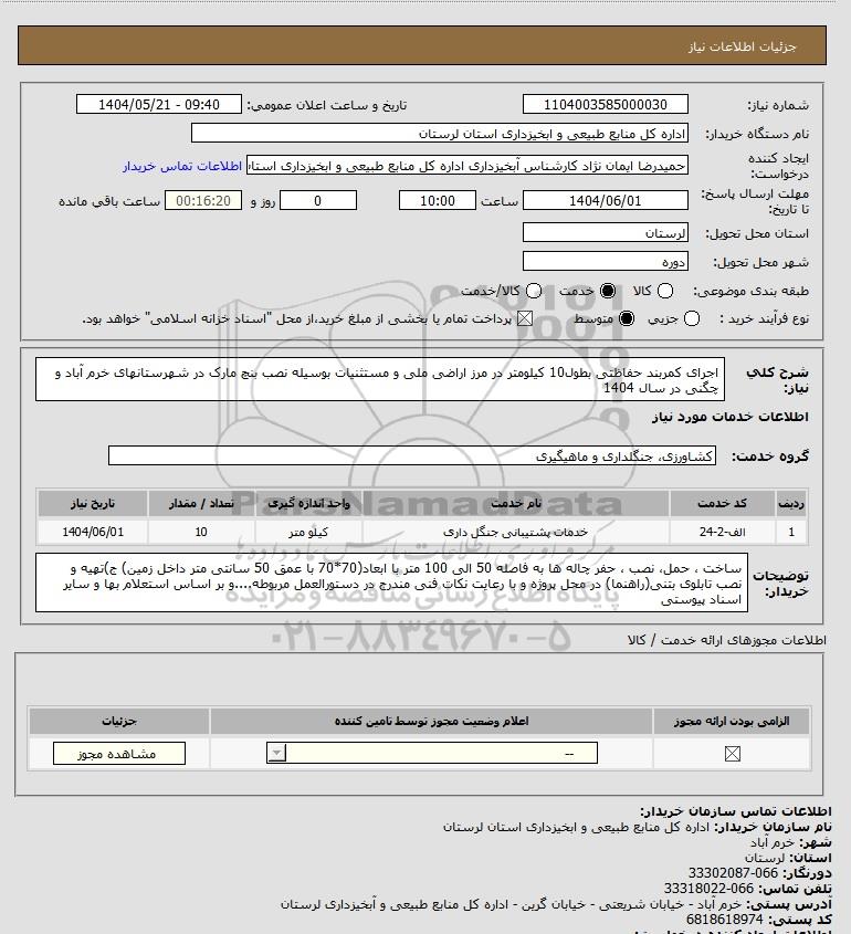 شرح کلی نیاز: اجرای کمربند حفاظتی بطول10 کیلومتر در مرز اراضی ملی و مستثنیات بوسیله نصب بنچ مارک در شهرستانهای خرم آباد و چگنی در سال 1404