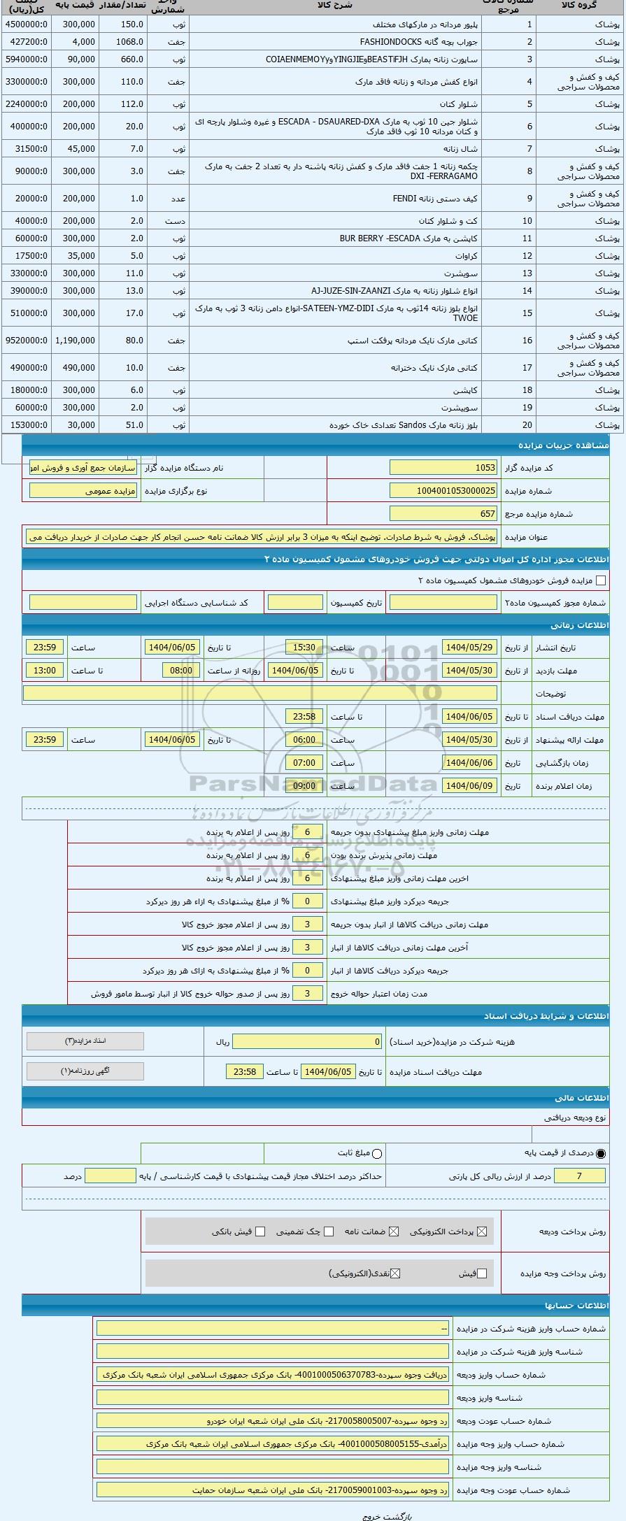 مزایده عمومی مزایده پوشاک. فروش به شرط صادرات. توضیح اینکه به میزان 3 برابر ارزش کالا ضمانت نامه حسن انجام کار جهت صادرات از خریدار دریافت برگزار میگردد. از کلیه افراد متخصص و شرکت‌های واجد شرایط دعوت به عمل می‌آید تا در این مزایده با کد خبرگزاری پارس نماد : 9445448 شرکت نمایند تاریخ شروع مزایده : 1404/05/29 مهلت شرکت در مزایده: تا پایان روز 1404/06/05 مکان برگزاری اموال واگذاری استان‌های تهران و دسته‌بندی‌های مربوط به این حراجی متفرقه میباشد.