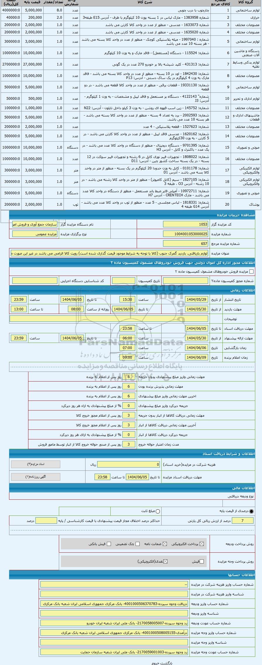 | کد مزایده گزار | 1053 | نام دستگاه مزایده گزار | سازمان جمع آوری و فروش اموال تملیکی | |