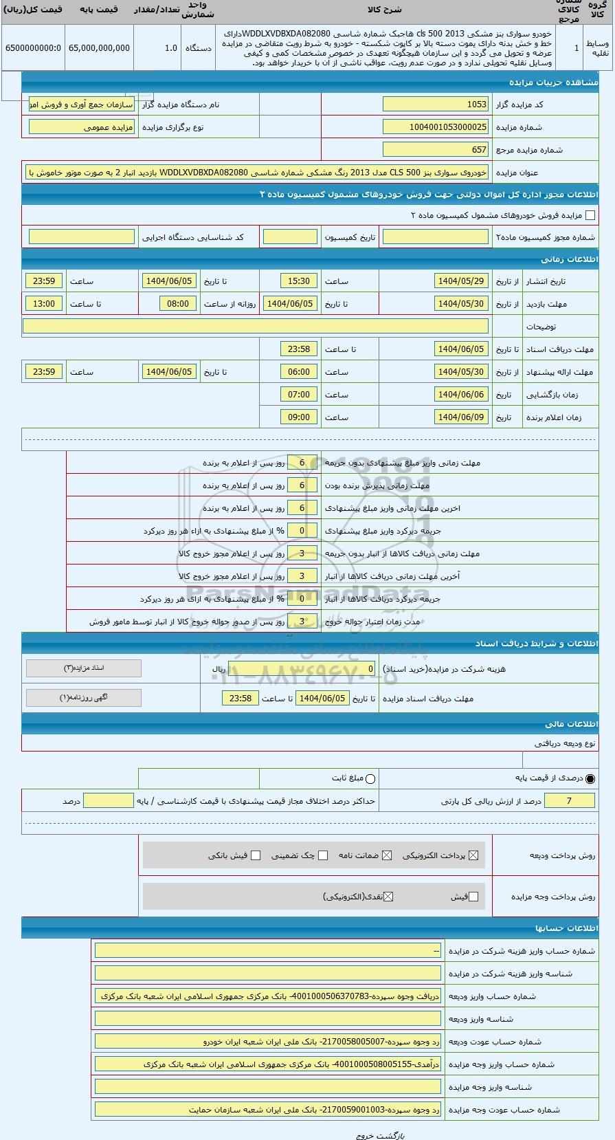 | وسایط نقلیه | 1 | خودرو سواری بنز مشکی cls 500 2013 هاجبک شماره شاسی WDDLXVDBXDA082080دارای خط و خش بدنه دارای یموت دسته بالا بر کاپوت شکسته - خودرو به شرط رویت متقاضی در مزایده عرضه و تحویل می گردد و این سازمان هیچگونه تعهدی در خصوص مشخصات کمی و کیفی وسایل نقلیه تحویلی ندارد و در صورت عدم رویت، عواقب ناشی از آن با خریدار خواهد بود. | دستگاه | 1.0 | 65,000,000,000 | 6500000000:0 |