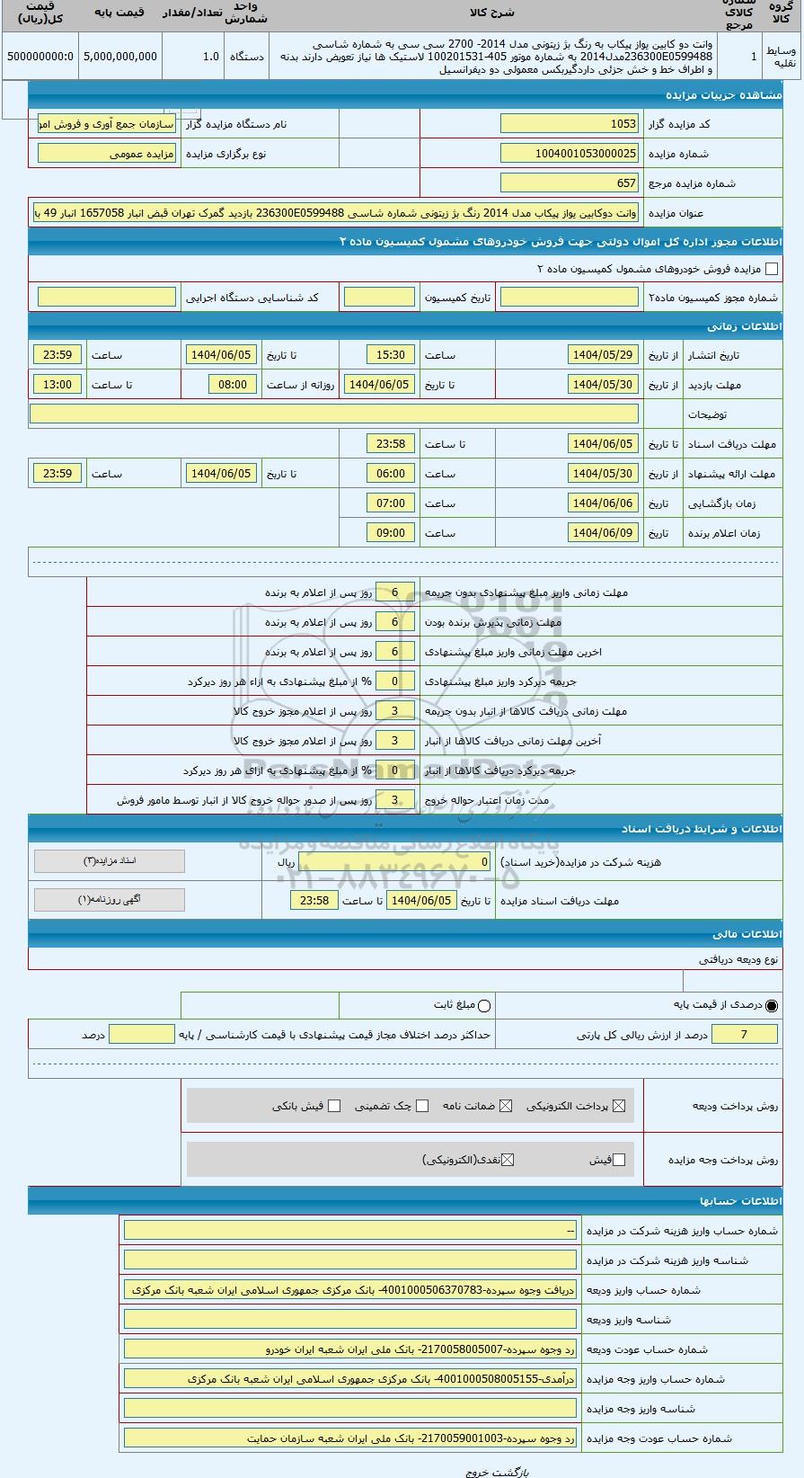 | کد مزایده گزار | 1053 | نام دستگاه مزایده گزار | سازمان جمع آوری و فروش اموال تملیکی | |