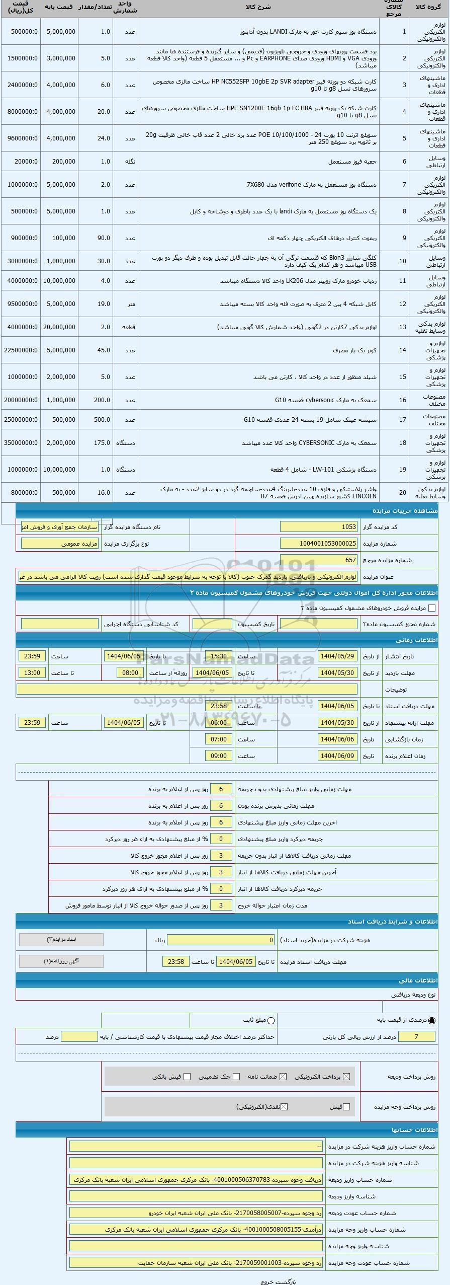 کد مزایده گزار | 1053 | نام دستگاه مزایده گزار | سازمان جمع آوری و فروش اموال تملیکی | |