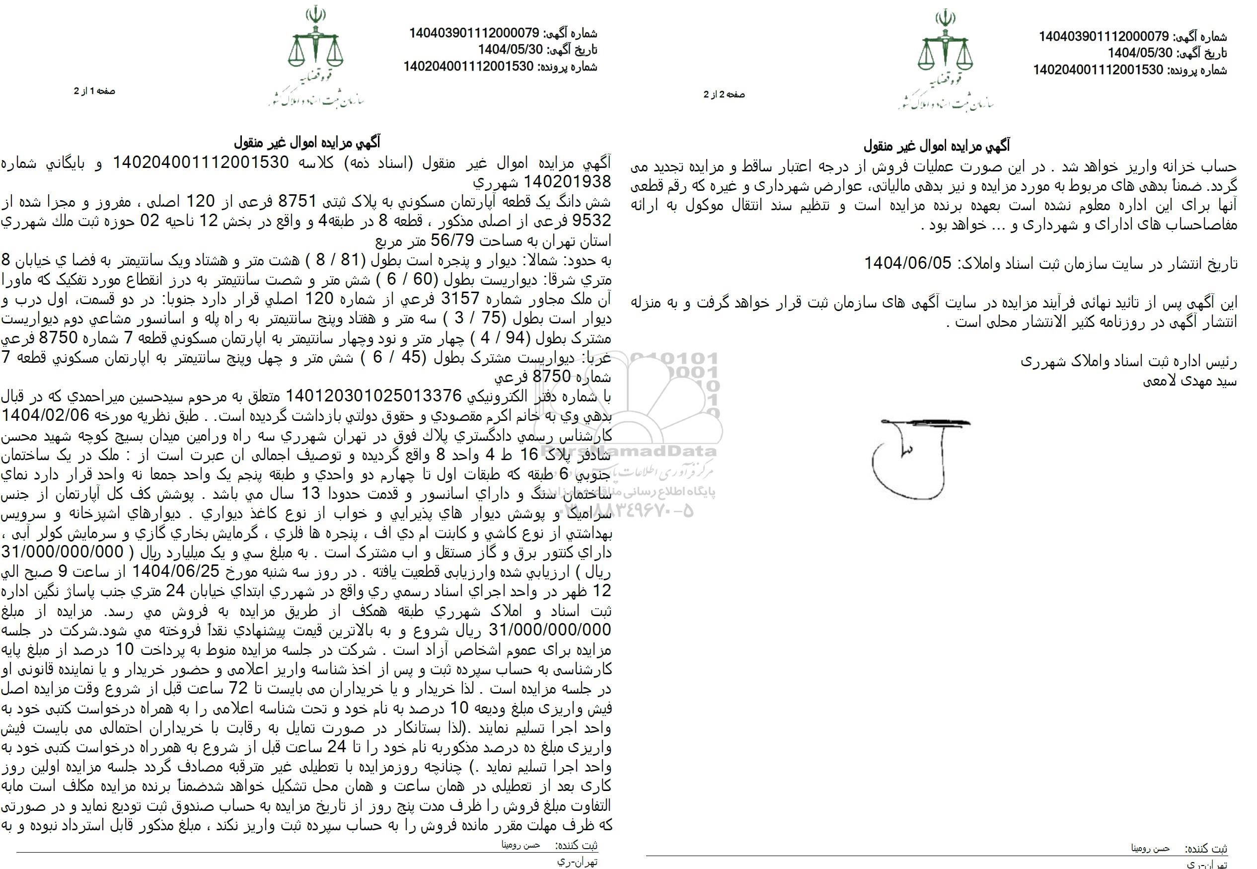 مزایده فروش ششدانگ یک قطعه آپارتمان مسکونی به پلاک ثبتی 8751 فرعی از 120 اصلی، مفروز و مجزا شده از 9532 فرعی از اصلی مذکور، به مساحت 56/79 متر مربع