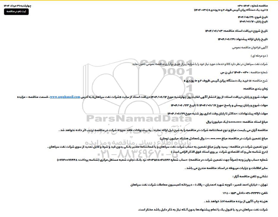 مناقصه خرید یک دستگاه پرکن گریس ظروف 2 و 10 پوندی , مناقصه خرید یک دستگاه پرکن گریس ظروف 2 و 10 پوندی
