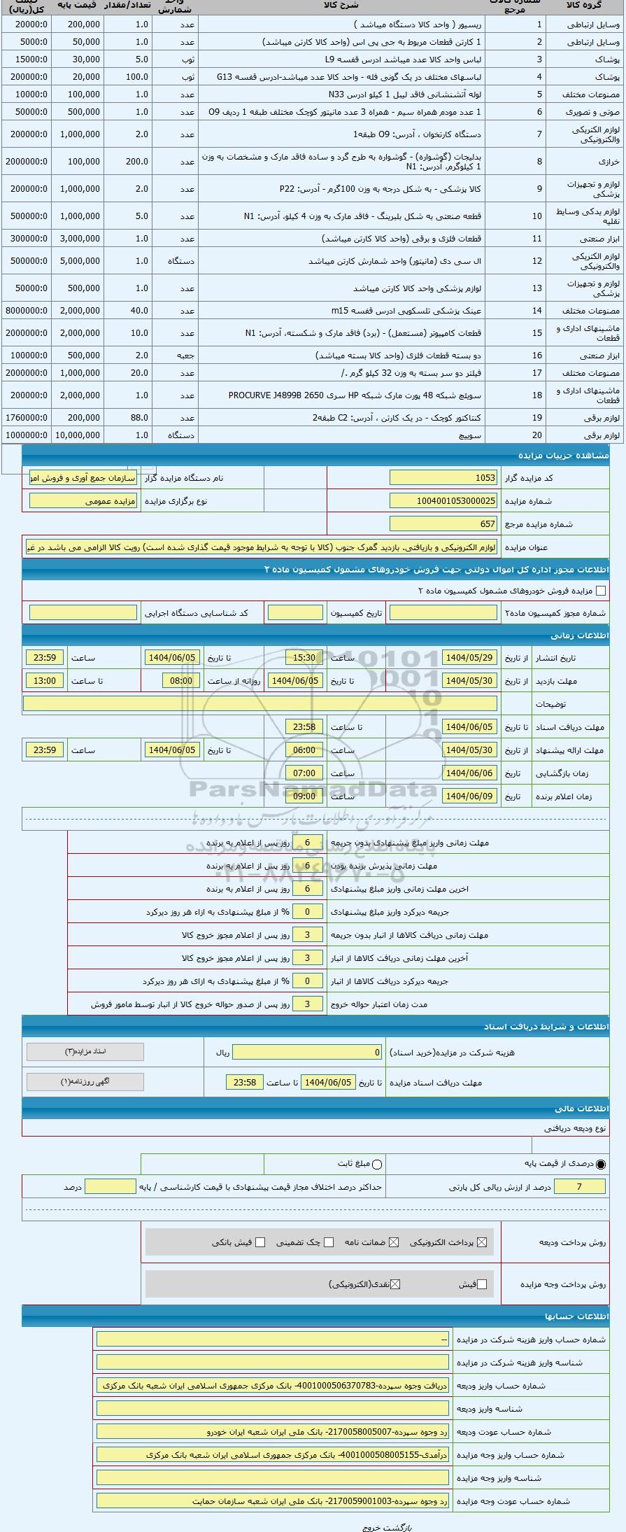 مزایده عمومی مزایده لوازم الکترونیکی و بازیافتی. بازدید گمرک جنوب (کالا با توجه به شرایط موجود قیمت گذاری شده است) رویت کالا الزامی می باشد برگزار میگردد. از کلیه افراد متخصص و شرکتهای واجد شرایط دعوت به عمل میآید تا در این مزایده با کد خبرگزاری پارس نماد : 9445915 شرکت نمایند تاریخ شروع مزایده : 1404/05/29 مهلت شرکت در مزایده: تا پایان روز 1404/06/05