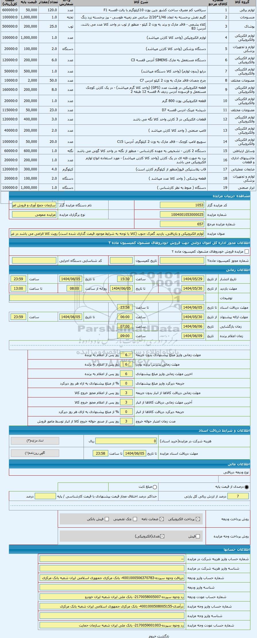 | کد مزایده گزار | 1053 | نام دستگاه مزایده گزار | سازمان جمع آوری و فروش اموال تملیکی | |