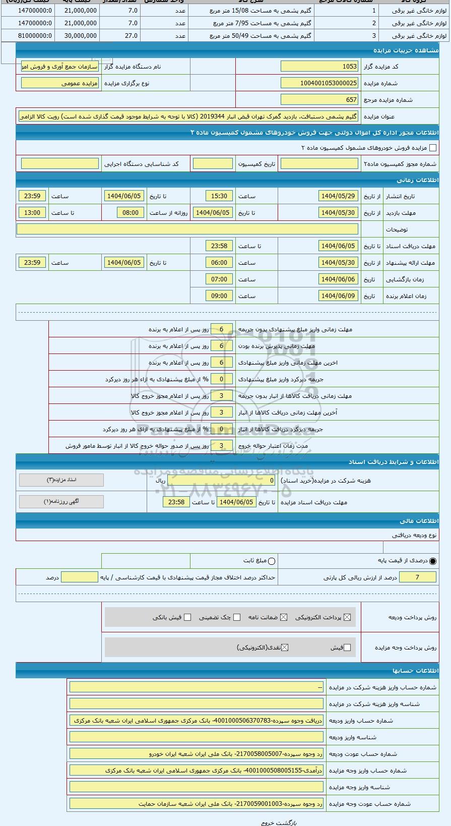 | کد مزایده گزار | 1053 | نام دستگاه مزایده گزار | سازمان جمع آوری و فروش اموال تملیکی | |