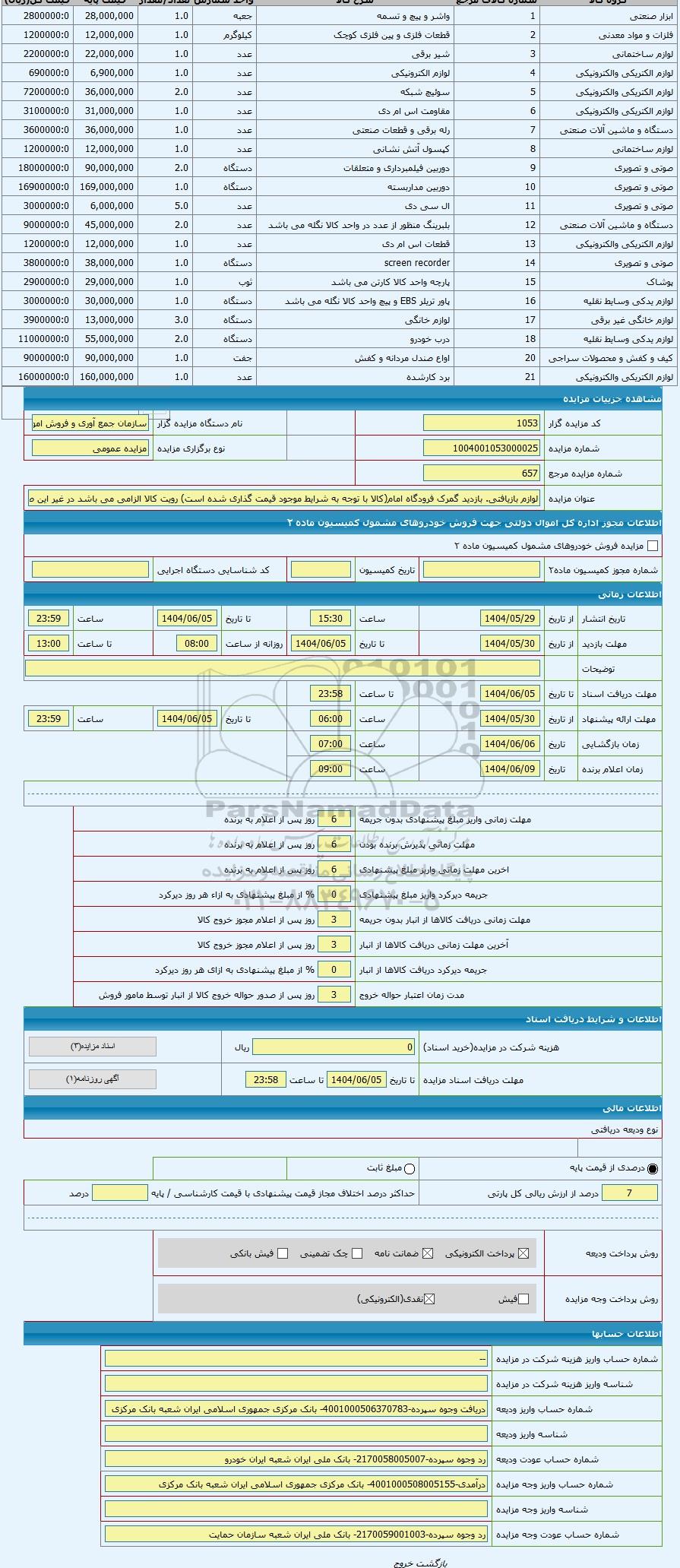 | کد مزایده گزار | 1053 | نام دستگاه مزایده گزار | سازمان جمع آوری و فروش اموال تملیکی | |