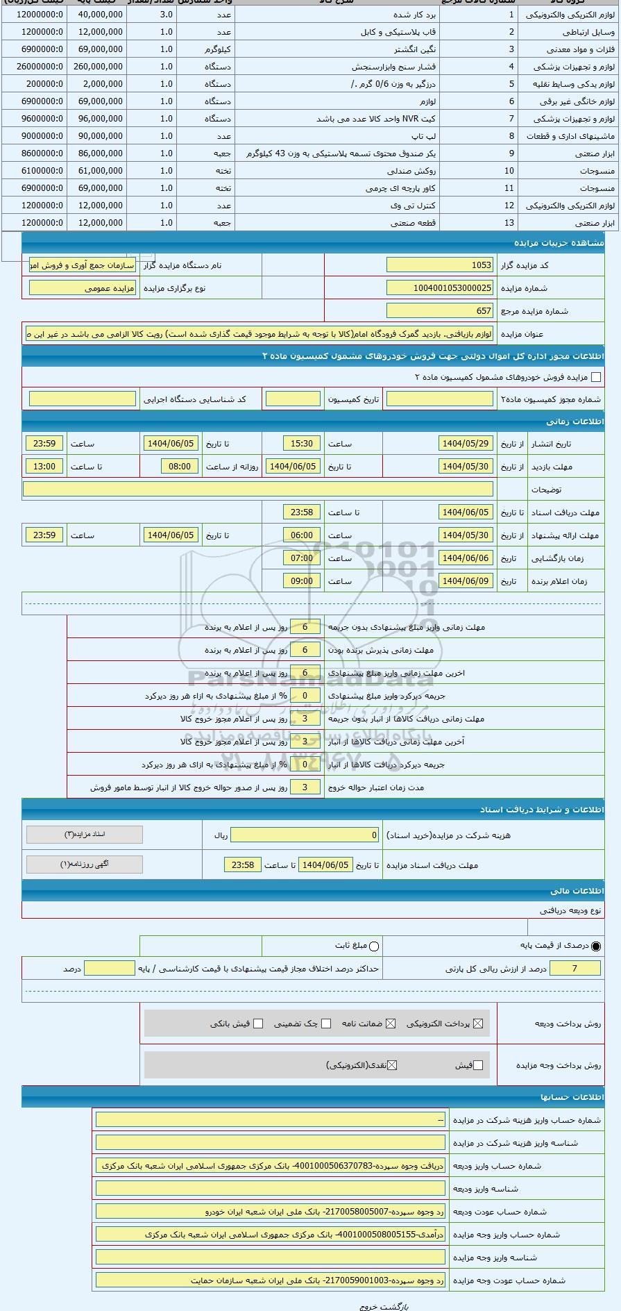 مزایده عمومی مزایده لوازم بازیافتی. بازدید گمرک فرودگاه امام(کالا با توجه به شرایط موجود قیمت گذاری شده است) رویت کالا الزامی می باشد در غی برگزار میگردد. از کلیه افراد متخصص و شرکت‌های واجد شرایط دعوت به عمل می‌آید تا در این مزایده با کد خبرگزاری پارس نماد : 9446065 شرکت نمایند تاریخ شروع مزایده : 1404/05/29 مهلت شرکت در مزایده: تا پایان روز 1404/06/05 مکان برگزاری اموال واگذاری استان‌های تهران و دسته‌بندی‌های مربوط به این حراجی برق, تجهیزات کارخانه ها و ماشین آلات صنعتی, سیم و کابل, کامپیوتر, پلاستیک ، پلی اتیلن و مستر بچ, تجهیزات پزشکی, متفرقه میباشد.