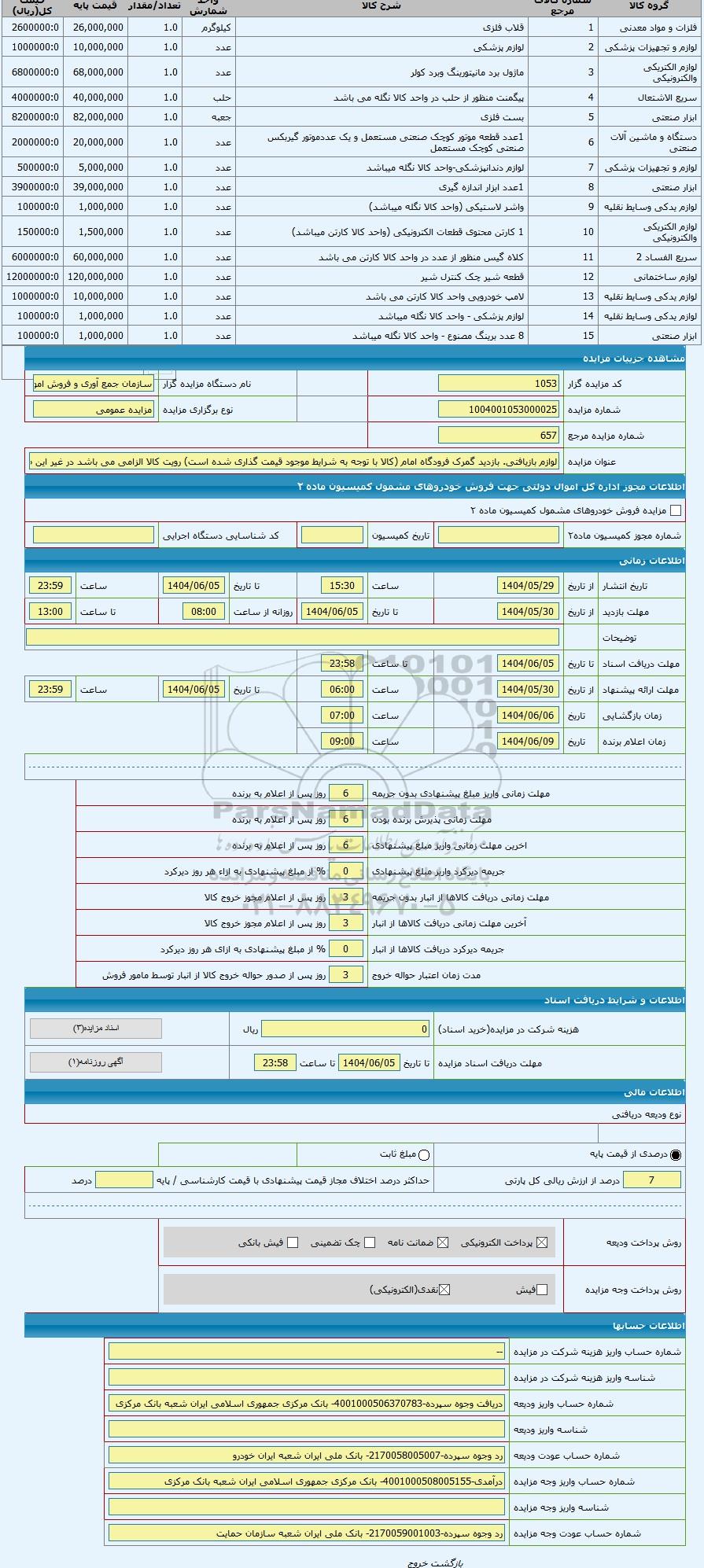 عنوان مزایدهلوازم بازیافتی. بازدید گمرک فرودگاه امام (کالا با توجه به شرایط موجود قیمت گذاری شده است) رویت کالا الزامی می باشد در غیر این صورت مسئولیت آن بر عهده خریدار می با شد.