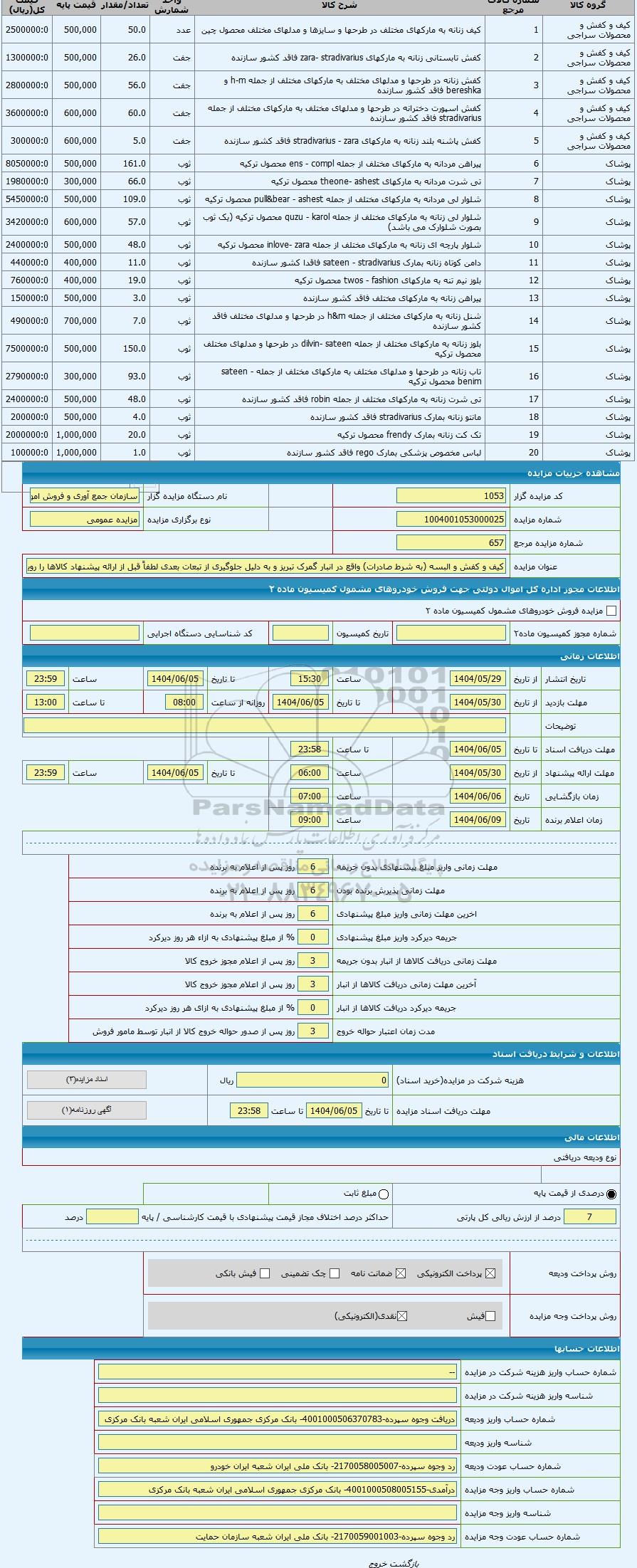 عنوان مزایدهکیف و کفش و البسه (به شرط صادرات) واقع در انبار گمرک تبریز و به دلیل جلوگیری از تبعات بعدی لطفاً قبل از ارائه پیشنهاد کالاها را رویت نمائید.