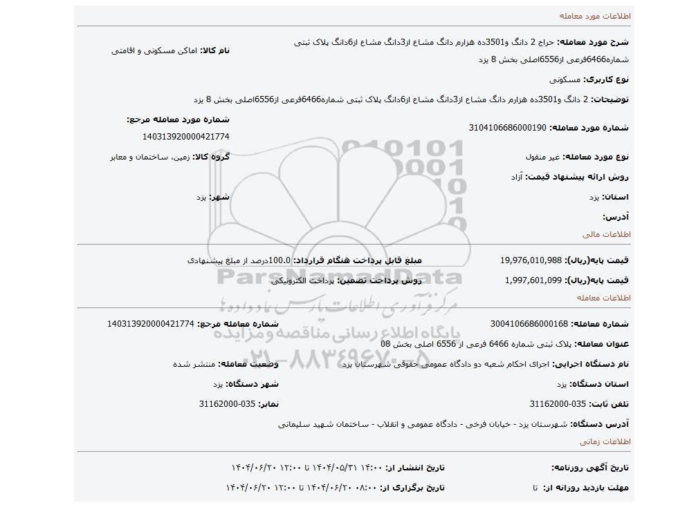 شرح مورد معامله: حراج 2 دانگ و3501ده هزارم دانگ مشاع از3دانگ مشاع از6دانگ پلاک ثبتی شماره6466فرعی از6556اصلی بخش 8 یزدنام کالا: اماکن مسکونی و اقامتی