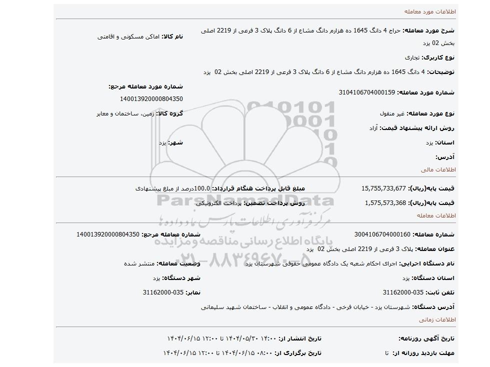 | شرح مورد معامله: حراج 4 دانگ 1645 ده هزارم دانگ مشاع از 6 دانگ پلاک 3 فرعی از 2219 اصلی بخش 02 یزد | نام کالا: اماکن مسکونی و اقامتی | |