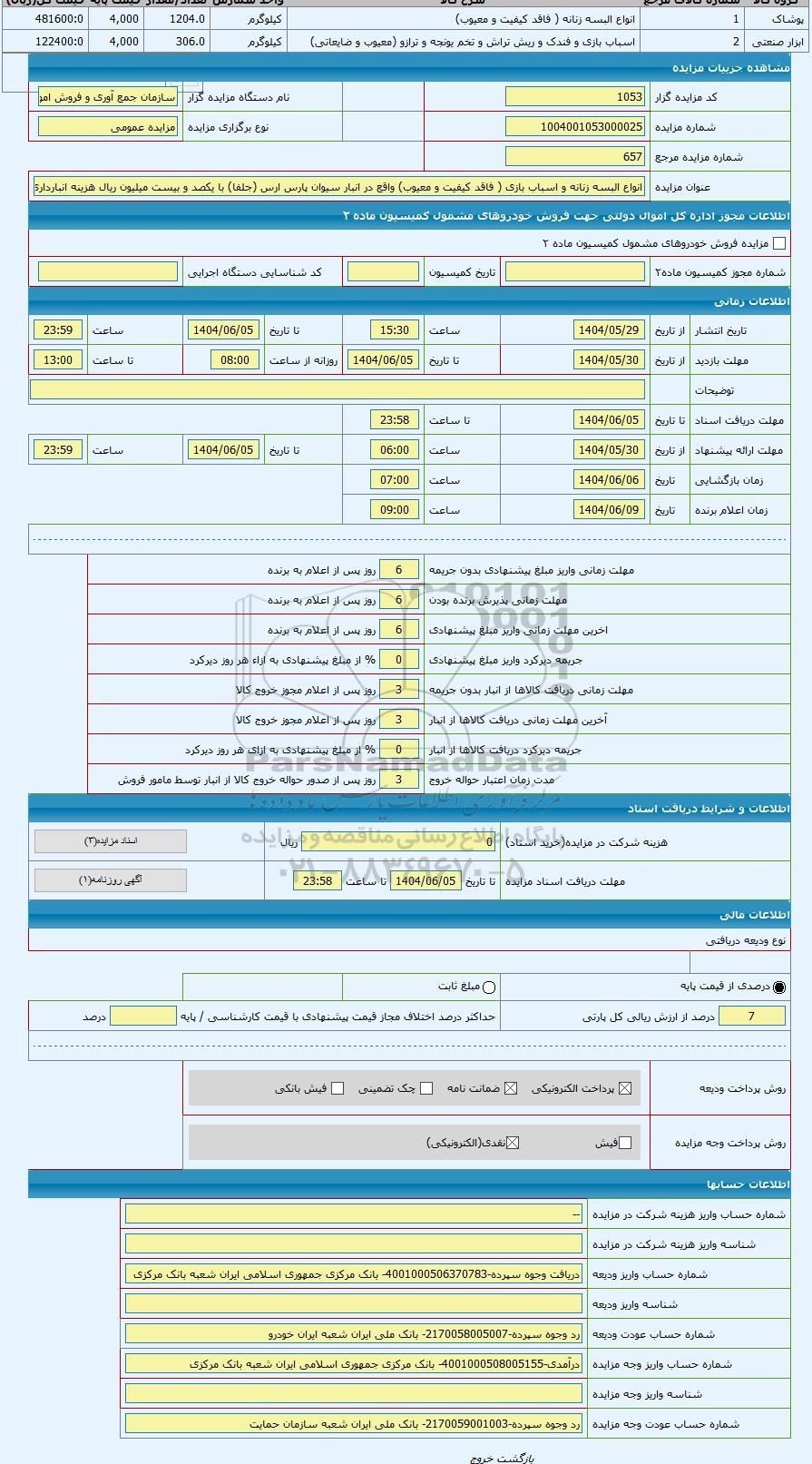 عنوان مزایدهانواع البسه زنانه و اسباب بازی ( فاقد کیفیت و معیوب) واقع در انبار سیوان پارس ارس (جلفا) با یکصد و بیست میلیون ریال هزینه انبارداری که برعهده خریدار می باشد و به دلیل جلوگیری از تبعات بعدی لطفاً قبل از ارائه پیشنهاد کالاها را رویت نمائید.