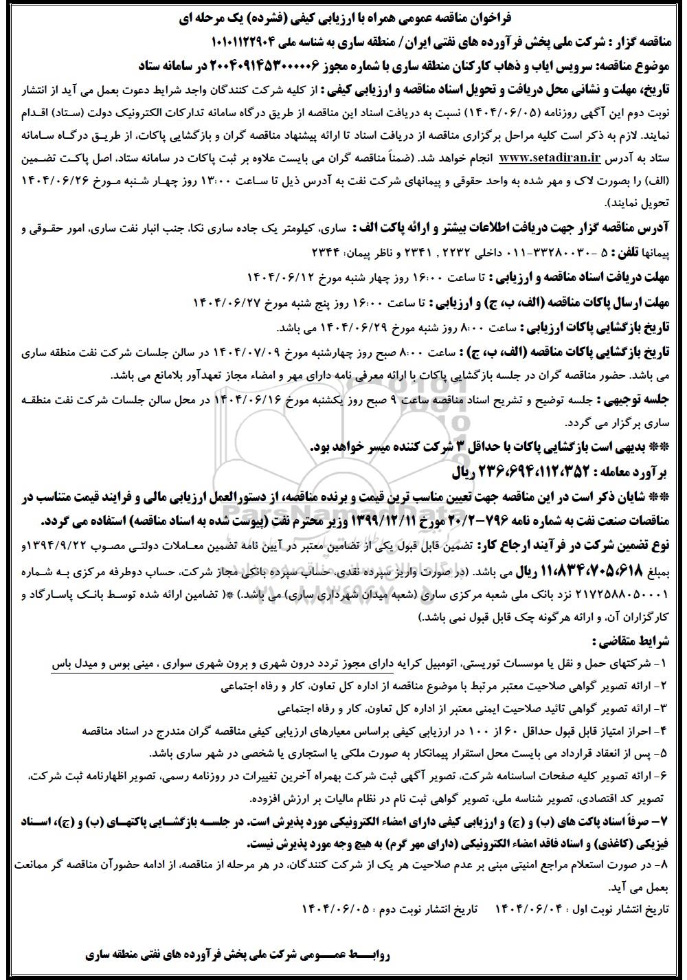 تاریخ بازگشایی پاکات مناقصه (الف، ب، ج) : ساعت 8 صبح روز چهارشنبه مورخ 1404.7.9 در سالن جلسات شرکت نفت منطقه ساری می باشد. حضور مناقصه گران در جلسه بازگشایی پاکات با ارائه معرفی نامه دارای مهر و امضاء مجاز تعهد آور بلامانع می باشد.