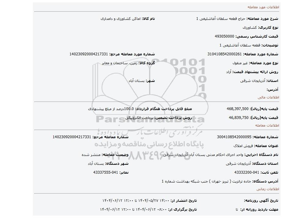 8 مزایده فروش زمین زراعی 9665598 1404/07/16 new not special not payed آذربایجان شرقی