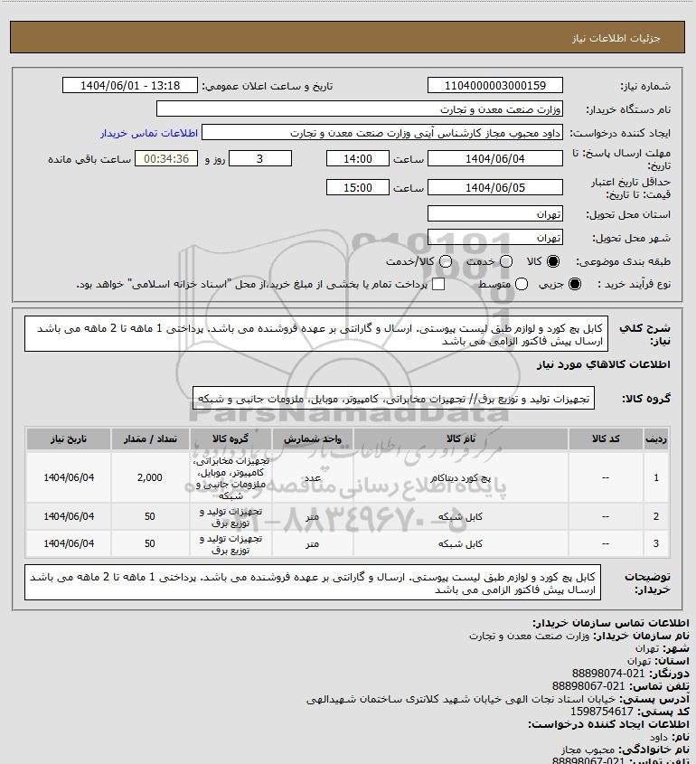 1 استعلام خرید پچکورد و پیگتل مطابق لیست پیوست - تسویه زمستان 1404 9665856 1404/07/16 new not special not payed تهران