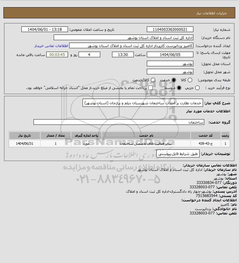شرح کلی نیاز: خدمات نظارت بر احداث ساختمان شهرستان دیلم و برازجان (استان بوشهر)