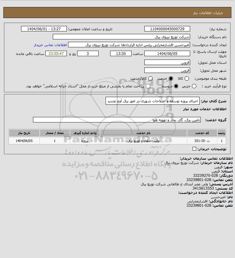 شرح کلی نیاز: اجرای پروزه توسعه و اصلاحات شهری در امور برق آوج تجدید