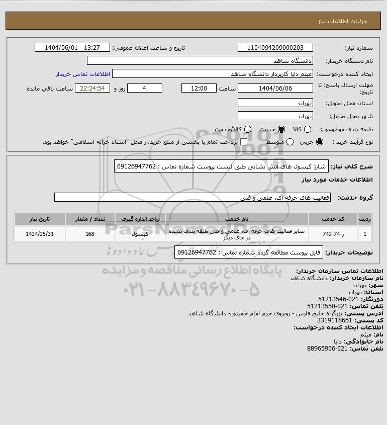 شرح کلی نیاز: شارژ کپسول های آتش نشانی طبق لیست پیوست شماره تماس : 09126947762