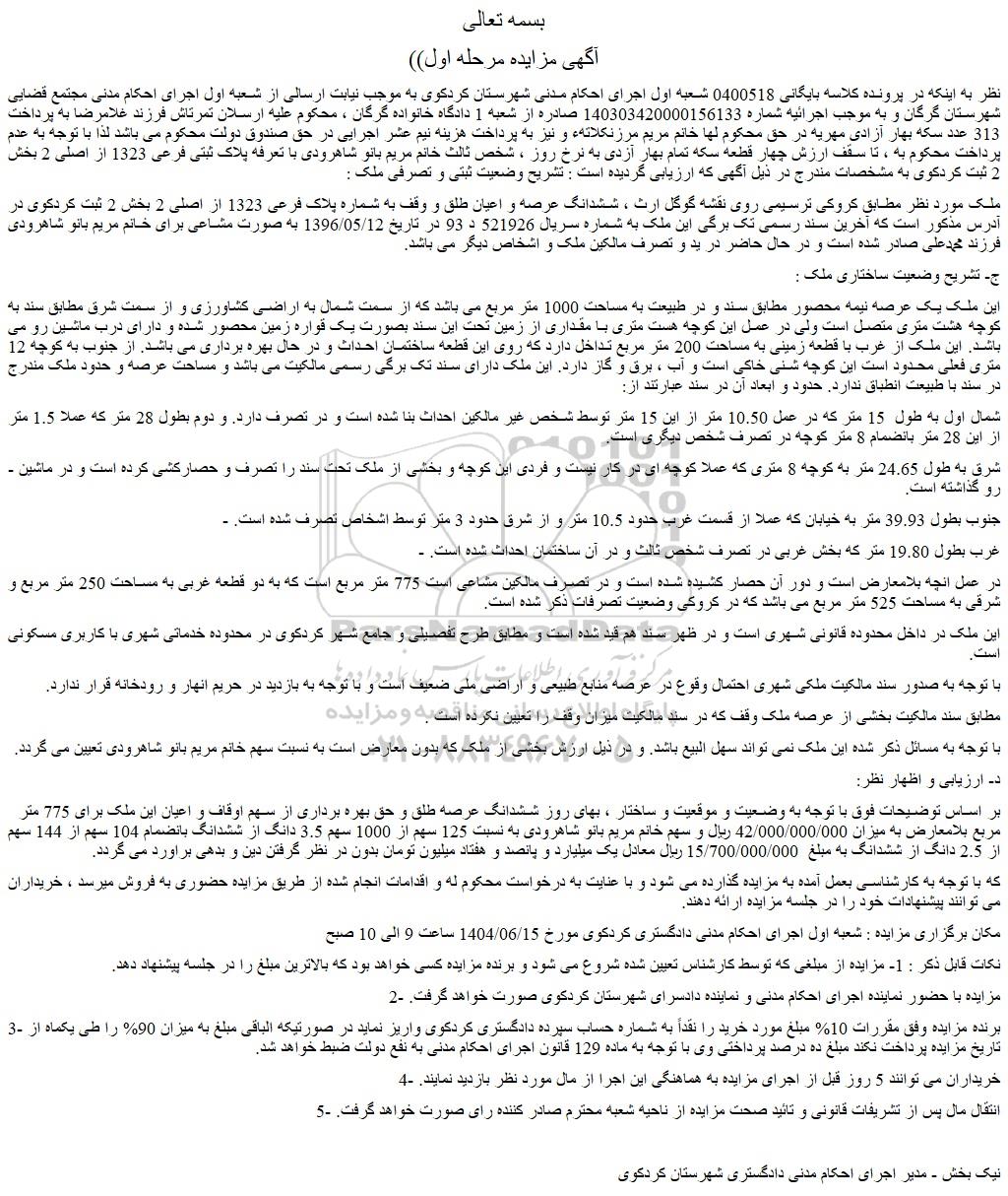 نظر به اینکه در پرونده کلاسه بایگانی 0400518 شعبه اول اجرای احکام مدنی شهرستان کردکوی به موجب نیابت ارسالی از شعبه اول اجرای احکام مدنی مجتمع قضایی شهرستان گرگان و به موجب اجرائیه شماره 140303420000156133 صادره از شعبه 1 دادگاه خانواده گرگان ، محکوم علیه ارسلان تمرتاش فرزند غلامرضا به پرداخت 313 عدد سکه بهار آزادی مهریه در حق محکوم لها خانم مریم مرزنکلاتهء و نیز به پرداخت هزینه نیم عشر اجرایی در حق صندوق دولت محکوم می باشد لذا با توجه به عدم پرداخت محکوم به ، تا سقف ارزش چهار قطعه سکه تمام بهار آزدی به نرخ روز ، شخص ثالث خانم مریم بانو شاهرودی با تعرفه پلاک ثبتی فرعی 1323 از اصلی 2 بخش 2 ثبت کردکوی به مشخصات مندرج در ذیل آگهی که ارزیابی گردیده است : تشریح وضعیت ثبتی و تصرفی ملک :