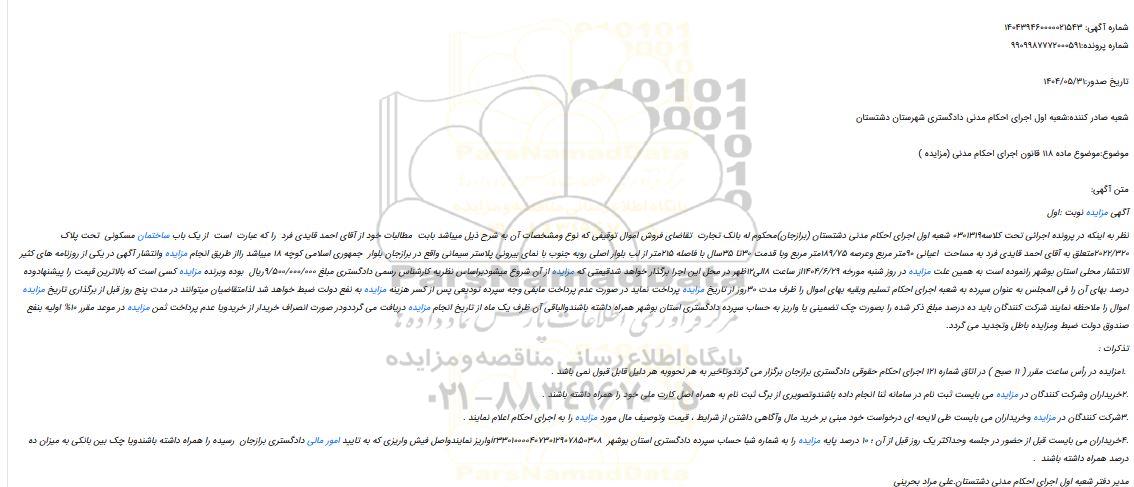نظر به اینکه در پرونده اجرائی تحت کلاسه0301319 شعبه اول اجرای احکام مدنی دشتستان (برازجان)محکوم له بانک تجارت تقاضای فروش اموال توقیفی که نوع ومشخصات آن به شرح ذیل میباشد بابت مطالبات خود از آقای احمد قایدی فرد را که عبارت است از یک باب ساختمان مسکونی تحت پلاک 2022/320متعلق به آقای احمد قایدی فرد به مساحت اعیانی 90متر مربع وعرصه 189/75متر مربع وبا قدمت 30تا 35سال با فاصله 215متر از لب بلوار اصلی روبه جنوب با نمای بیرونی پلاستر سیمانی واقع در برازجان بلوار جمهوری اسلامی کوچه 18 میباشد رااز طریق انجام مزایده وانتشار آگهی در یکی از روزنامه های کثیر الانتشار محلی استان بوشهر رانموده است به همین علت مزایده در روز شنبه مورخه 1404/6/29از ساعت 8الی12ظهر در محل این اجرا برگذار خواهد شدقیمتی که مزایده از آن شروع میشودبراساس نظریه کارشناس رسمی دادگستری مبلغ 9/500/000/000ریال بوده وبرنده مزایده کسی است که بالاترین قیمت را پیشنهادوده درصد بهای آن را فی المجلس به عنوان سپرده به شعبه اجرای احکام تسلیم وبقیه بهای اموال را ظرف مدت 30روز از تاریخ مزایده پرداخت نماید در صورت عدم پرداخت مابقی وجه سپرده تودیعی پس از کسر هزینه مزایده به نفع دولت ضبط خواهد شد لذامتقاضیان میتوانند در مدت پنج روز قبل از برگذاری تاریخ مزایده اموال را ملاحظه نمایند شرکت کنندگان باید ده درصد مبلغ ذکر شده را بصورت چک تضمینی یا واریز به حساب سپرده دادگستری استان بوشهر همراه داشته باشندوالباقی آن ظرف یک ماه از تاریخ انجام مزایده دریافت می گرددودر صورت انصراف خریدار از خریدویا عدم پرداخت ثمن مزایده در موعد مقرر 10% اولیه بنفع صندوق دولت ضبط ومزایده باطل وتجدید می گردد.