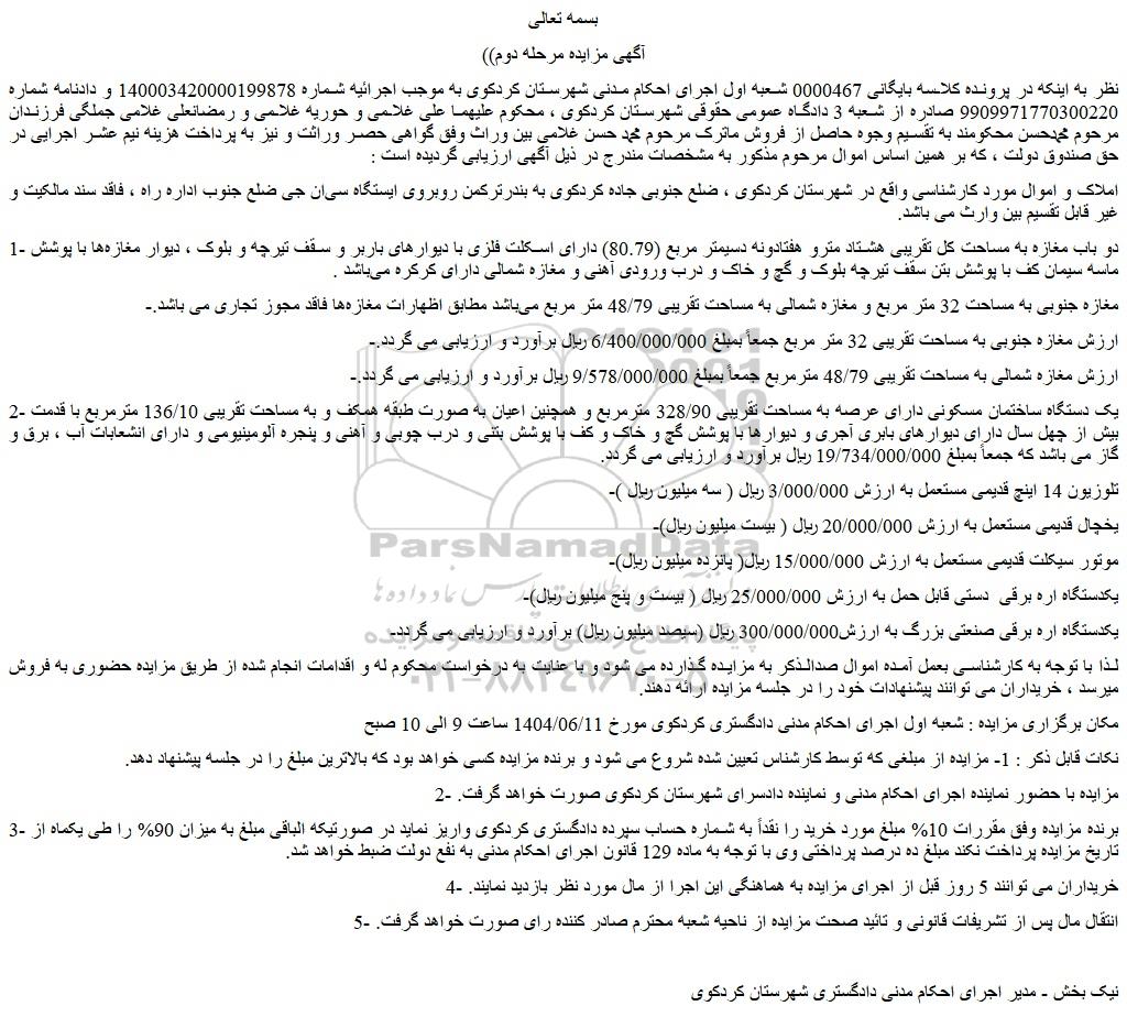 نظر به اینکه در پرونده کلاسه بایگانی 0000467 شعبه اول اجرای احکام مدنی شهرستان کردکوی به موجب اجرائیه شماره 140003420000199878 و دادنامه شماره 9909971770300220 صادره از شعبه 3 دادگاه عمومی حقوقی شهرستان کردکوی ، محکوم علیهما علی غلامی و حوریه غلامی و رمضانعلی غلامی جملگی فرزندان مرحوم محمدحسن محکومند به تقسیم وجوه حاصل از فروش ماترک مرحوم محمد حسن غلامی بین وراث وفق گواهی حصر وراثت و نیز به پرداخت هزینه نیم عشر اجرایی در حق صندوق دولت ، که بر همین اساس اموال مرحوم مذکور به مشخصات مندرج در ذیل آگهی ارزیابی گردیده است :