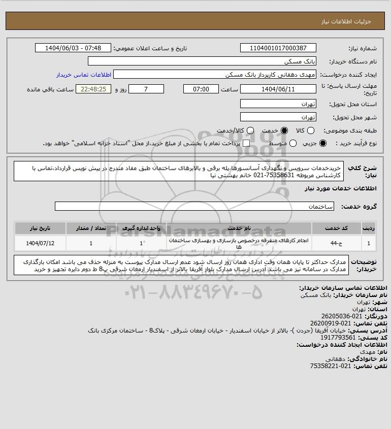 شرح کلی نیاز: خریدخدمات سرویس و نگهداری آسانسورها،پله برقی و بالابرهای ساختمان طبق مفاد مندرج در پیش نویس قرارداد،تماس با کارشناس مربوطه 75358631-021 خانم بهشتی نیا