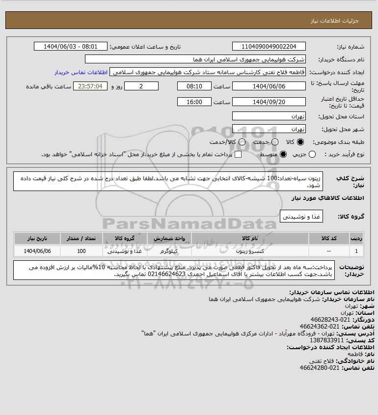 شرح کلی نیاز: زیتون سیاه-تعداد:100 شیشه-کالای انتخابی جهت تشابه می باشد.لطفا طبق تعداد درج شده در شرح کلی نیاز قیمت داده شود.