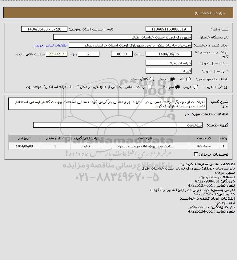 شرح کلی نیاز: اجرای جداول و دیگر کارهای عمرانی در سطح شهر و مناطق بازآفرینی قوچان مطابق استعلام پیوست که میبایستی استعلام تکمیل و در سامانه بارگزاری گردد