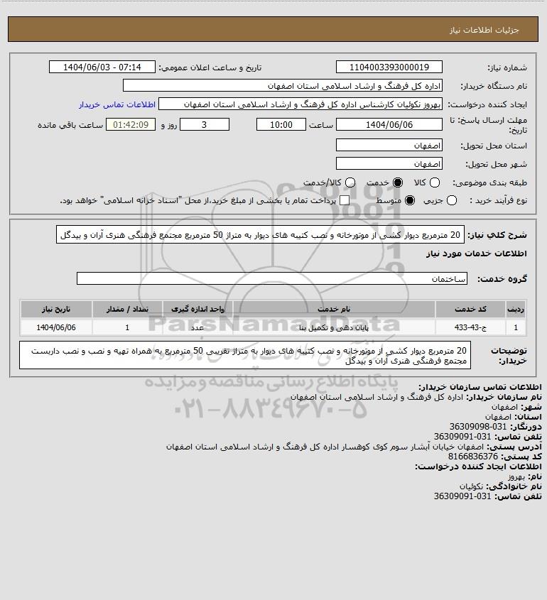 توضیحات خریدار: 20 مترمربع دیوار کشی از موتورخانه و نصب کتیبه های دیوار به متراژ تقریبی 50 مترمربع به همراه تهیه و نصب و نصب داربست مجتمع فرهنگی هنری آران و بیدگل