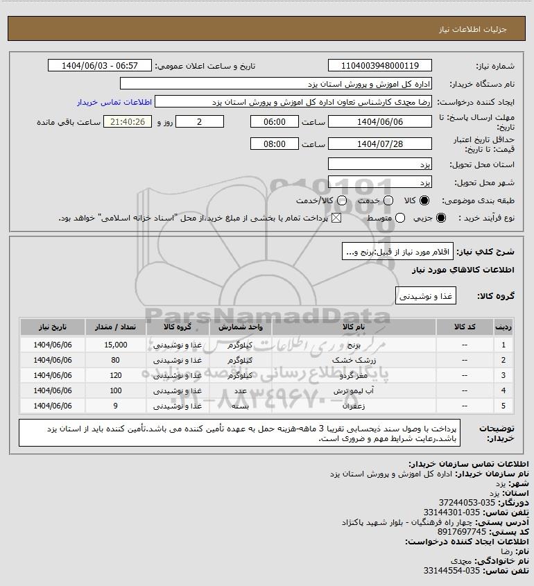 | 1 | -- | برنج | کیلوگرم | غذا و نوشیدنی | 15,000 | 1404/06/06 |