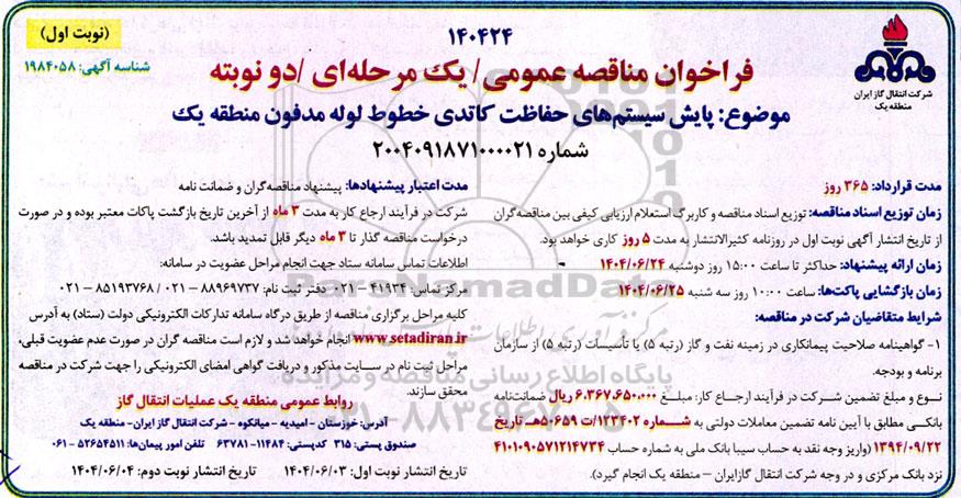 مناقصه عمومی پایش سیستم های حفاظت کاتدی خطوط لوله مدفون منطقه یک از کلیه افراد متخصص و شرکتها واجد شرایط دعوت به عمل میآید در مناقصه با کد خبرگزاری پارس نماد: 9448000 شرکت نمایند.