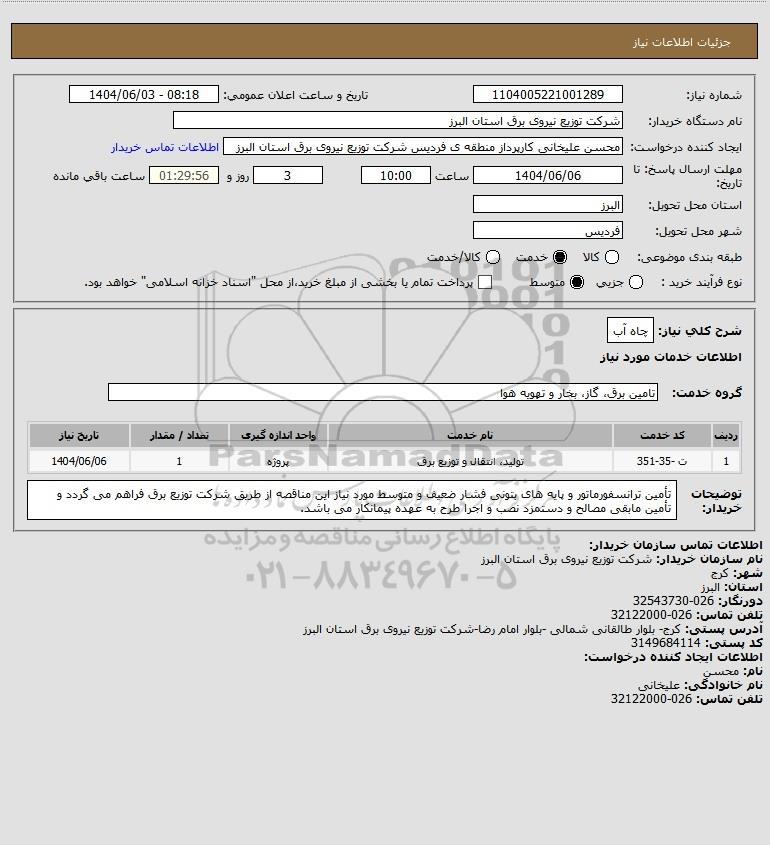 توضیحات خریدار:تأمین ترانسفورماتور و پایه های بتونی فشار ضعیف و متوسط مورد نیاز این مناقصه از طریق شرکت توزیع